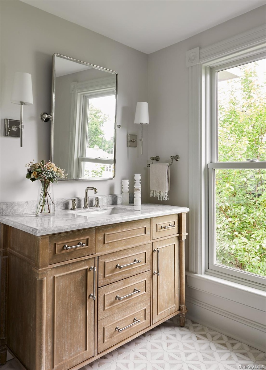 The third floor expands versatility with two generous but cozy bedrooms and full bathroom featuring vintage vanity set against striking geometric floor tiles. The third-floor turret creates an ideal children's playroom or nursery.