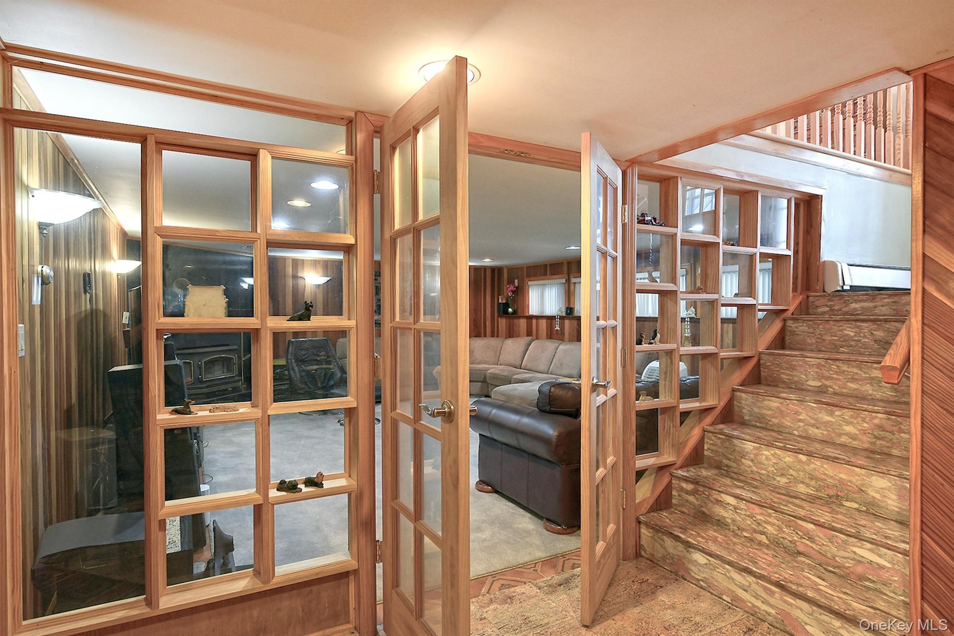 - Living room with wood walls and a wood stove