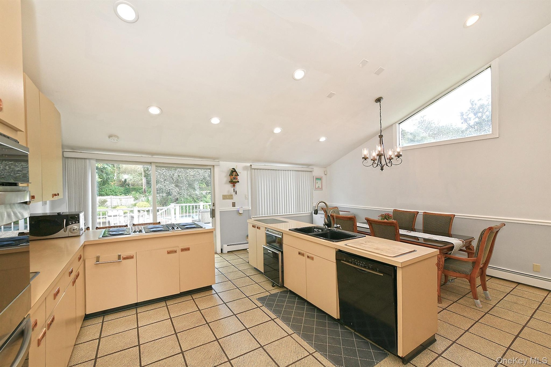 - Kitchen with decorative light fixtures, light tile patterned floors, vaulted ceiling, black dishwasher, and recessed lighting