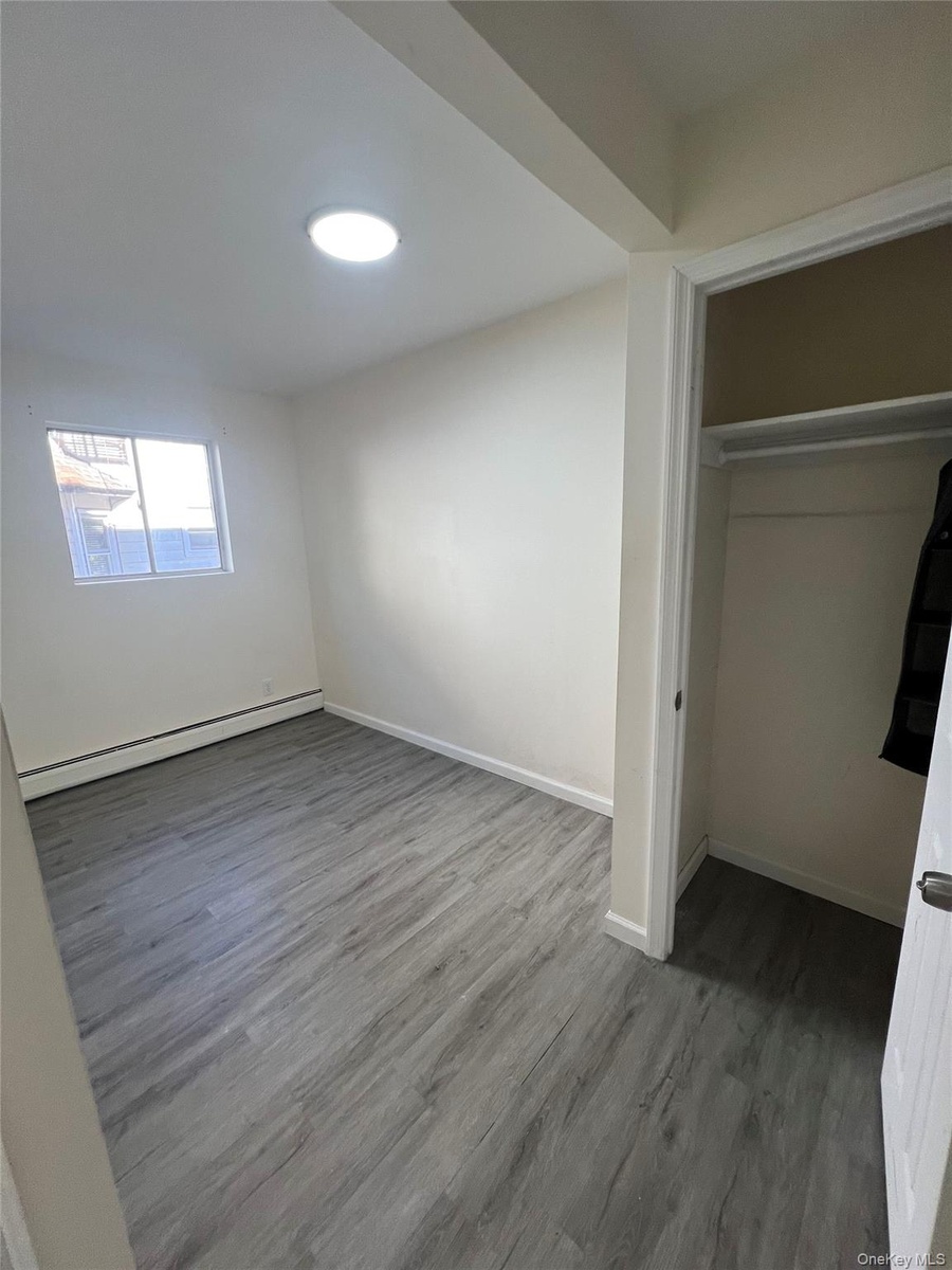 - Unfurnished bedroom featuring wood finished floors, a baseboard radiator, and a closet