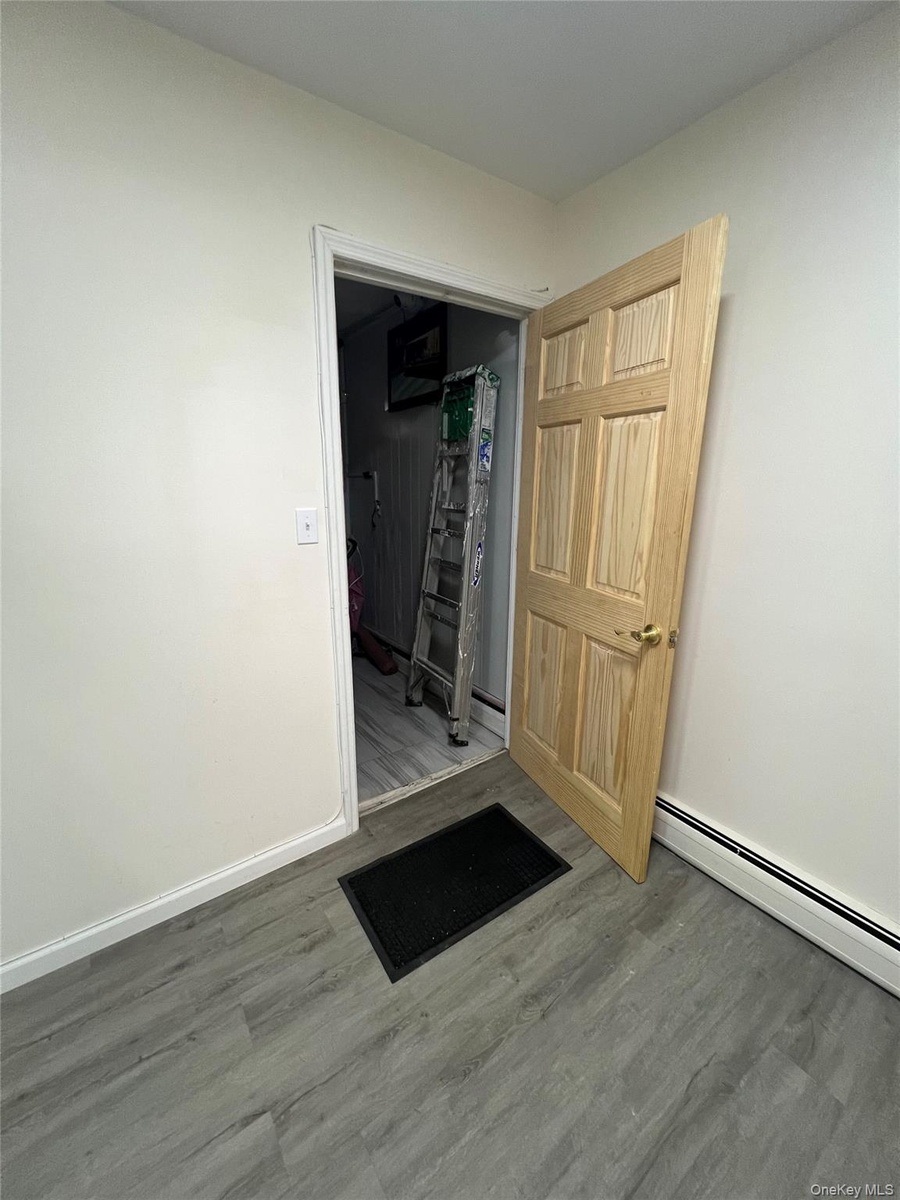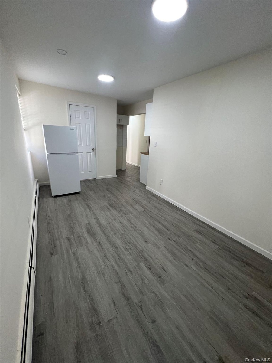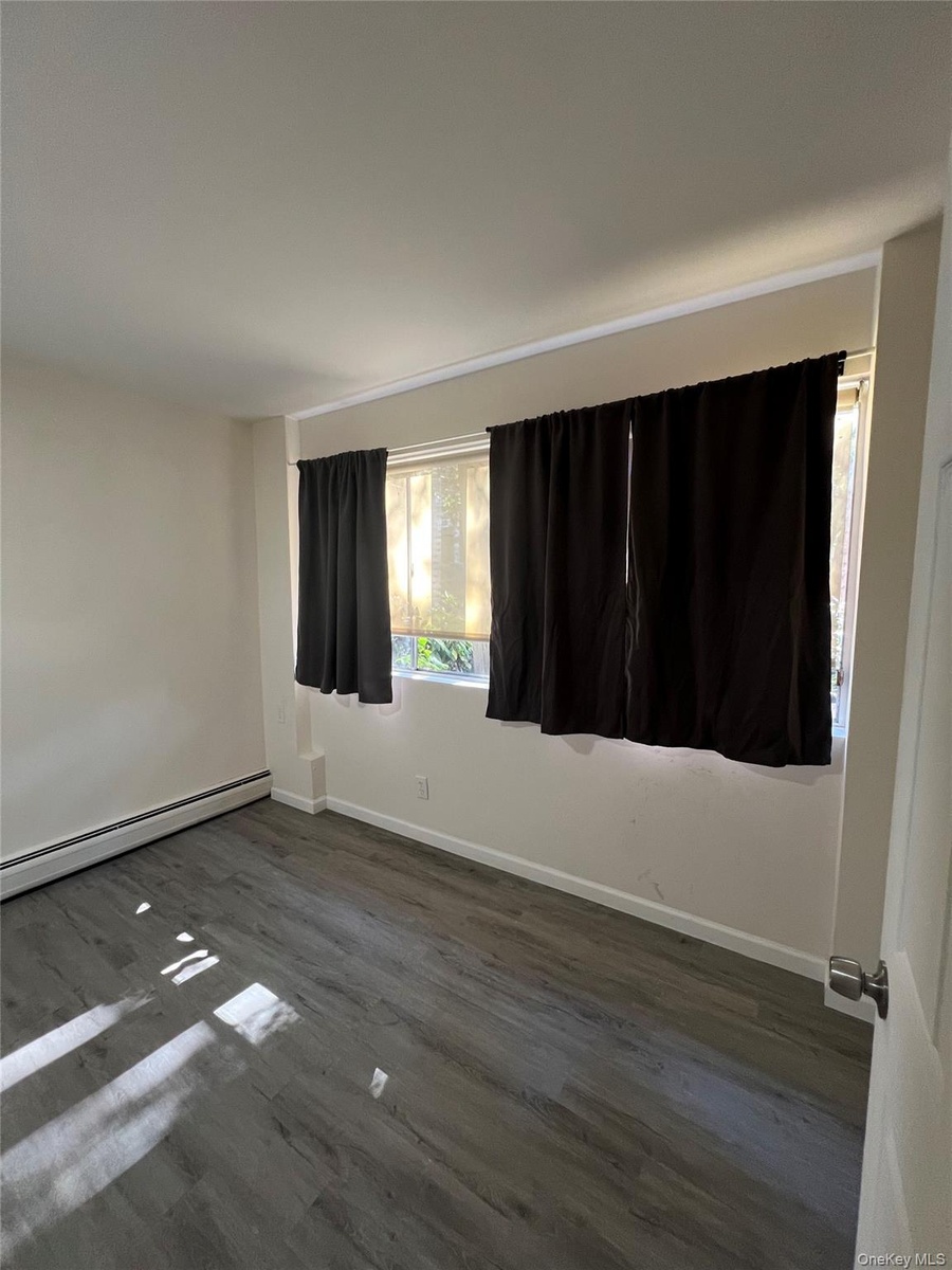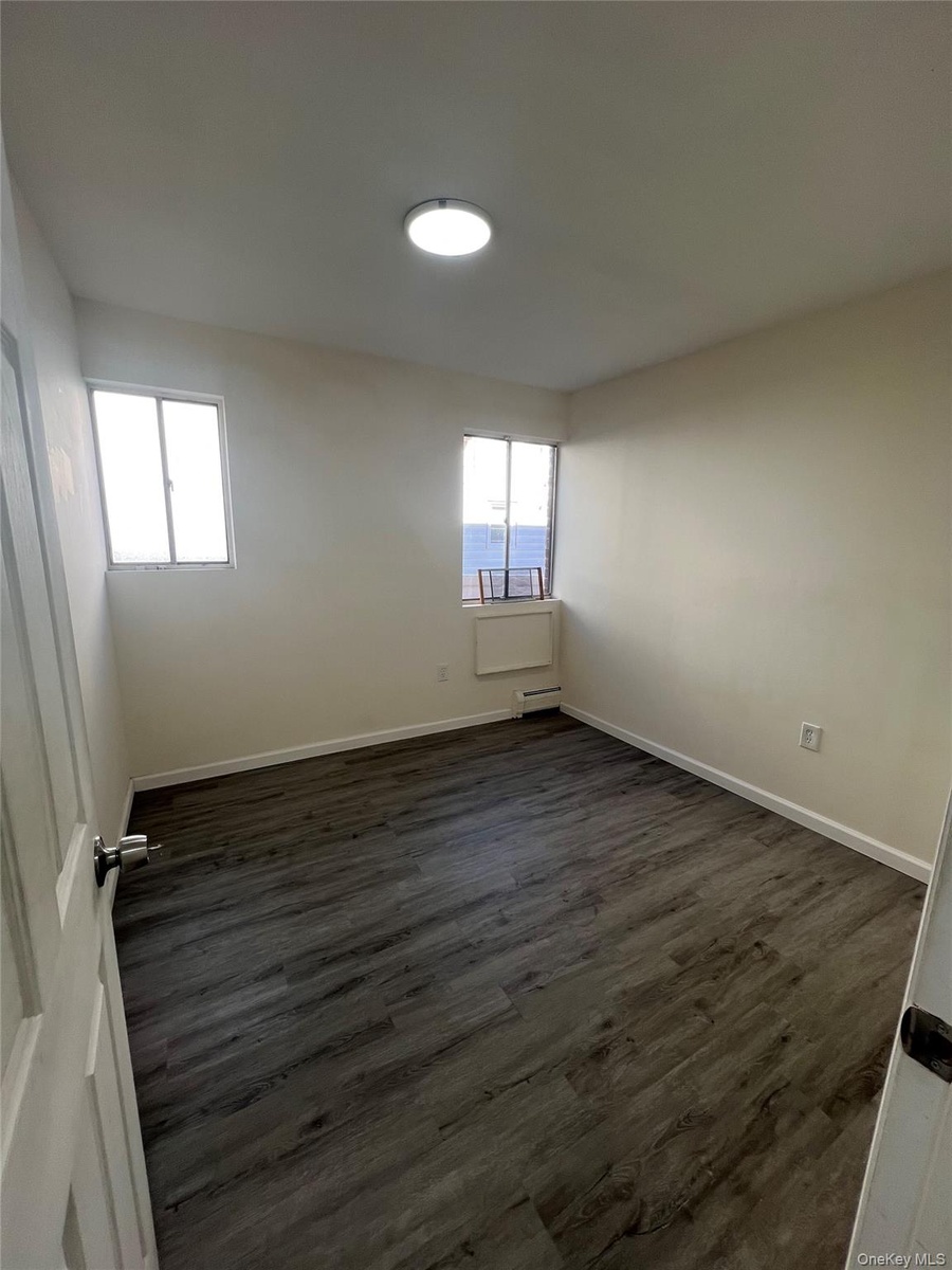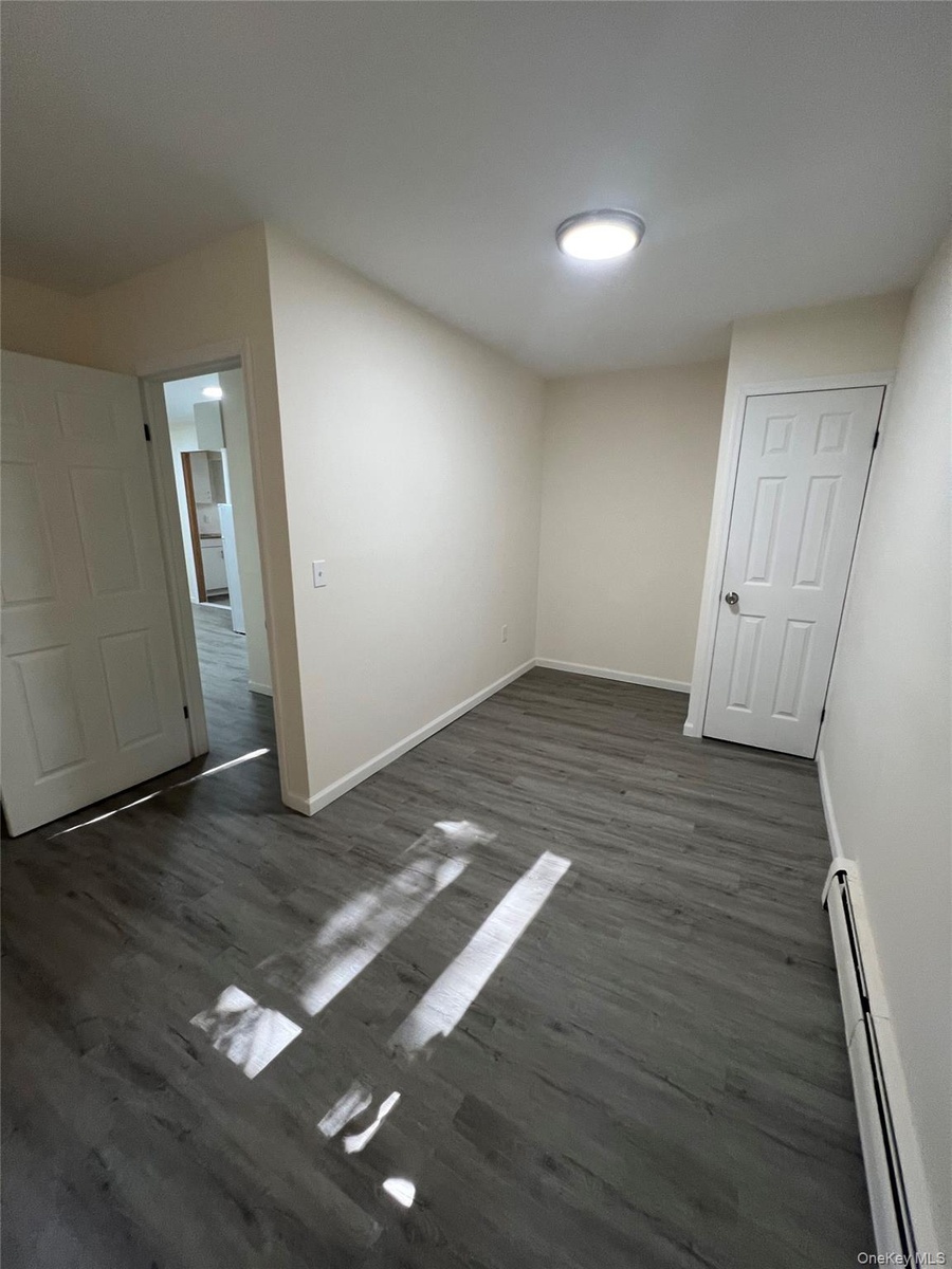 - Spare room with dark wood-style flooring and a baseboard heating unit