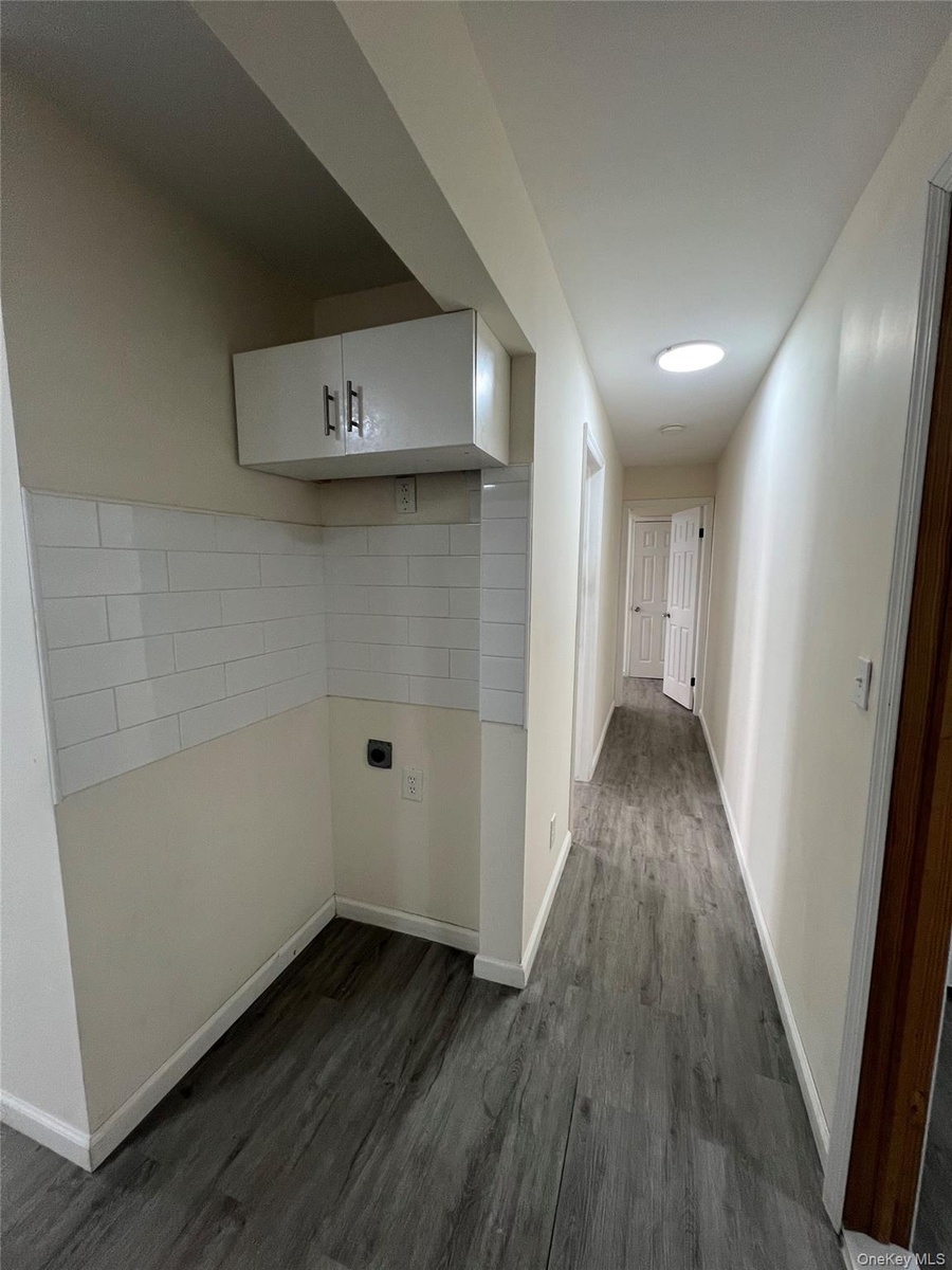 - Hall with dark wood-style flooring and baseboards