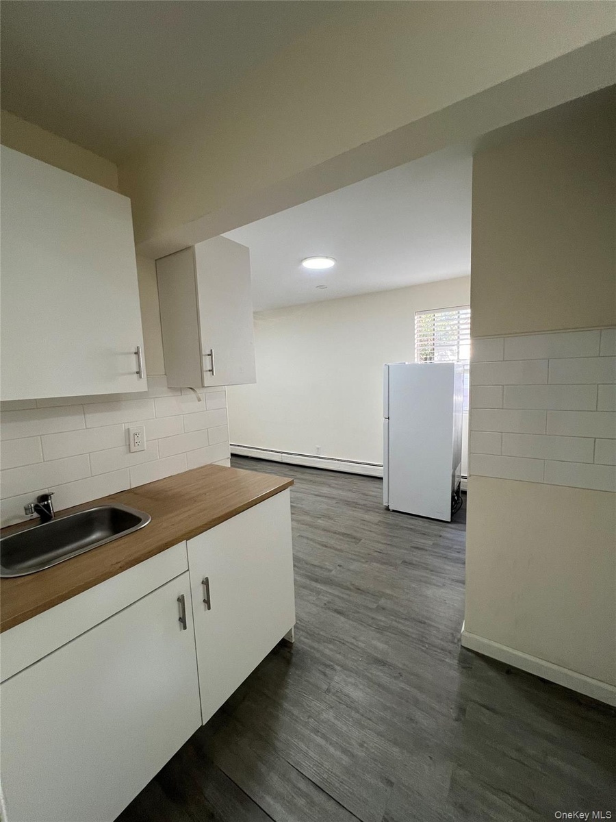 - White cabinets, dark wood-type flooring, freestanding refrigerator, a baseboard heating unit, and decorative backsplash