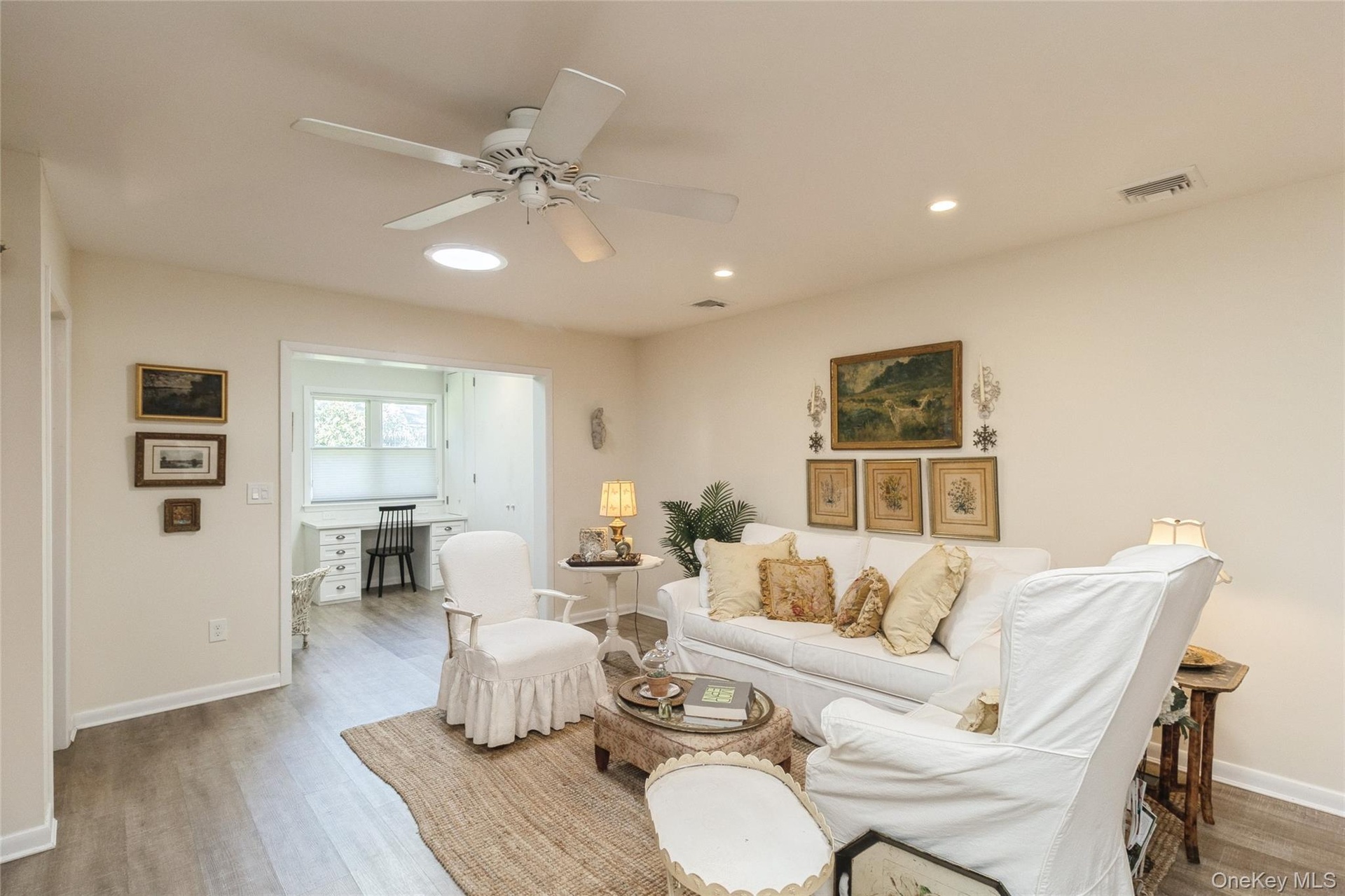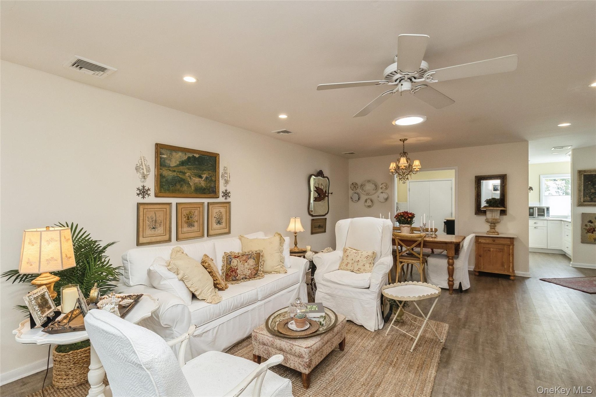 - A cozy and spacious living room with recessed lighting, wood-finished floors, and a ceiling fan.