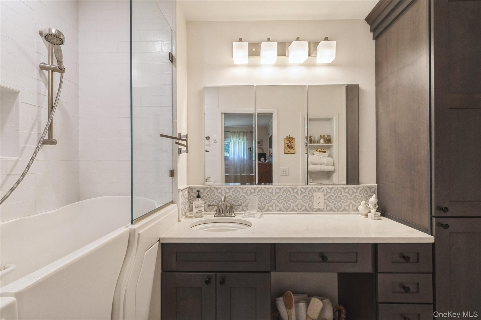 - A spa-like primary bathroom featuring a vanity and a tub/shower combination.