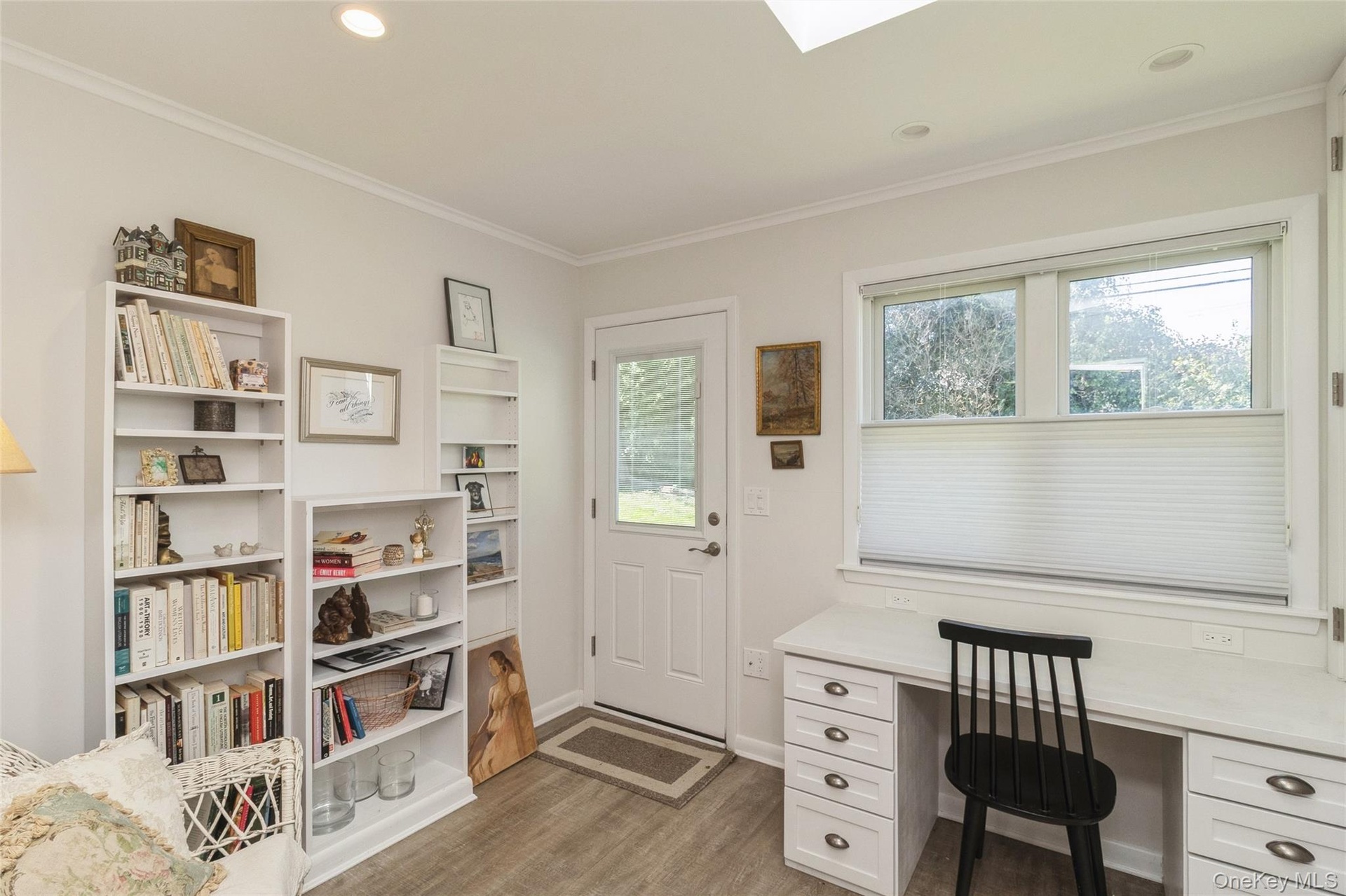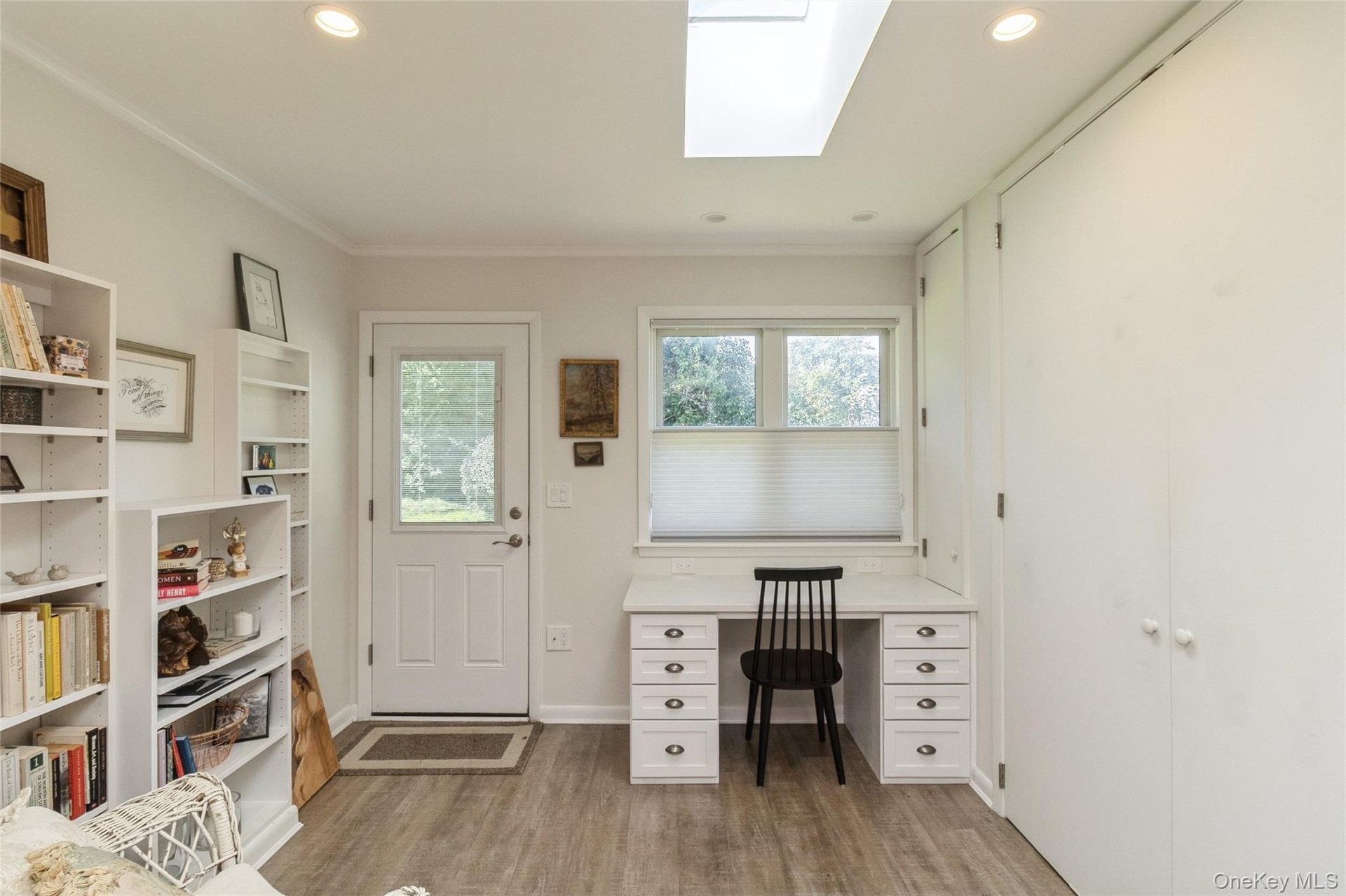 - An office/den, or reading nook featuring a skylight, light wood flooring, recessed lighting, and elegant crown molding.