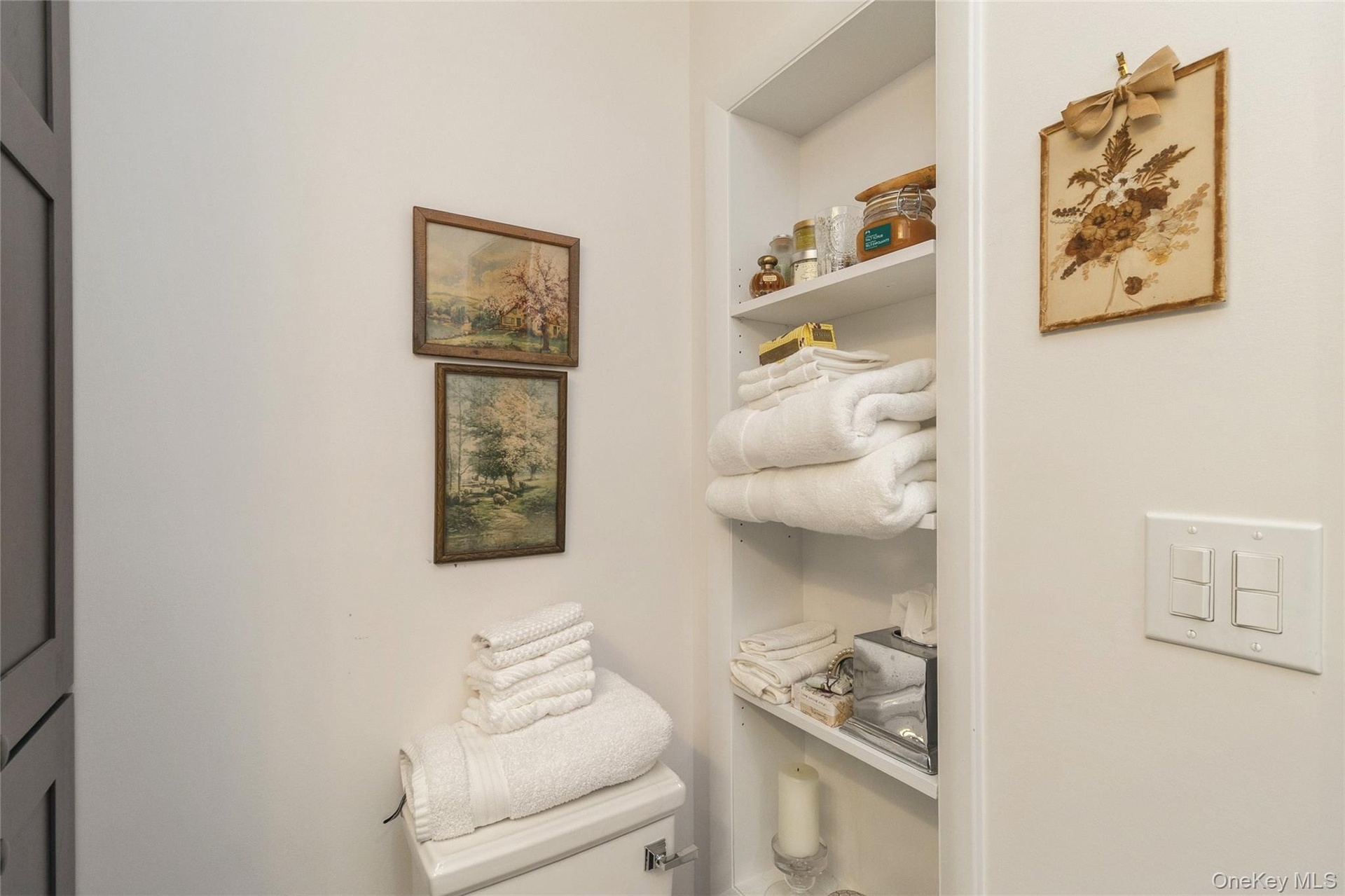 - Wash closet featuring a stacked washer and dryer, custom shelving