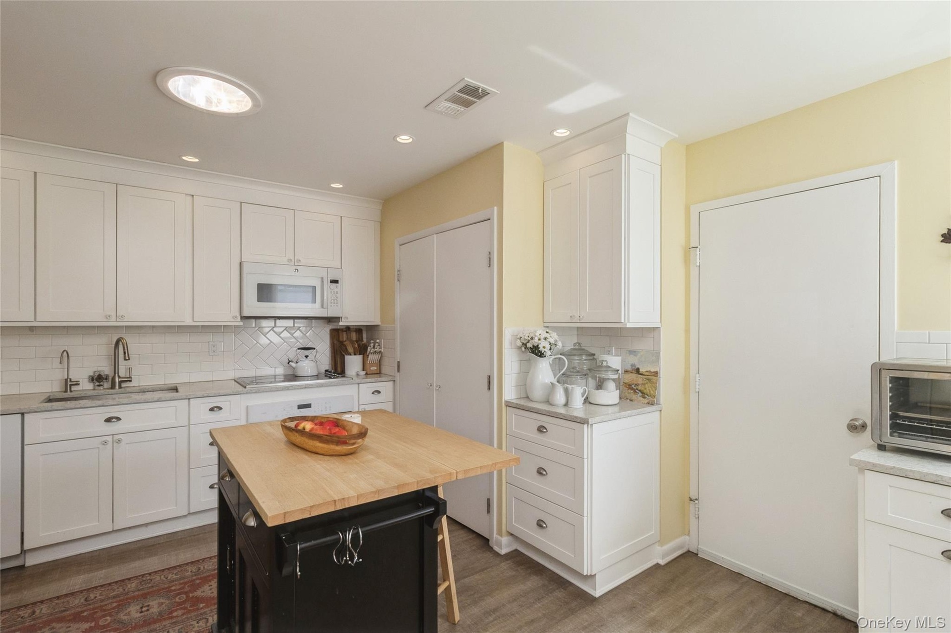 - A kitchen with white cabinetry, a decorative backsplash, and recessed lighting seamlessly opens to the dining area.