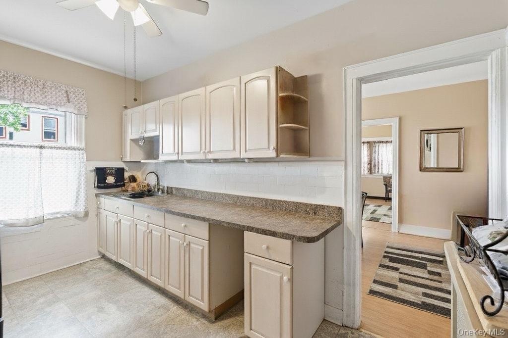- Kitchen with dark countertops, open shelves, backsplash, ceiling fan, and light floors