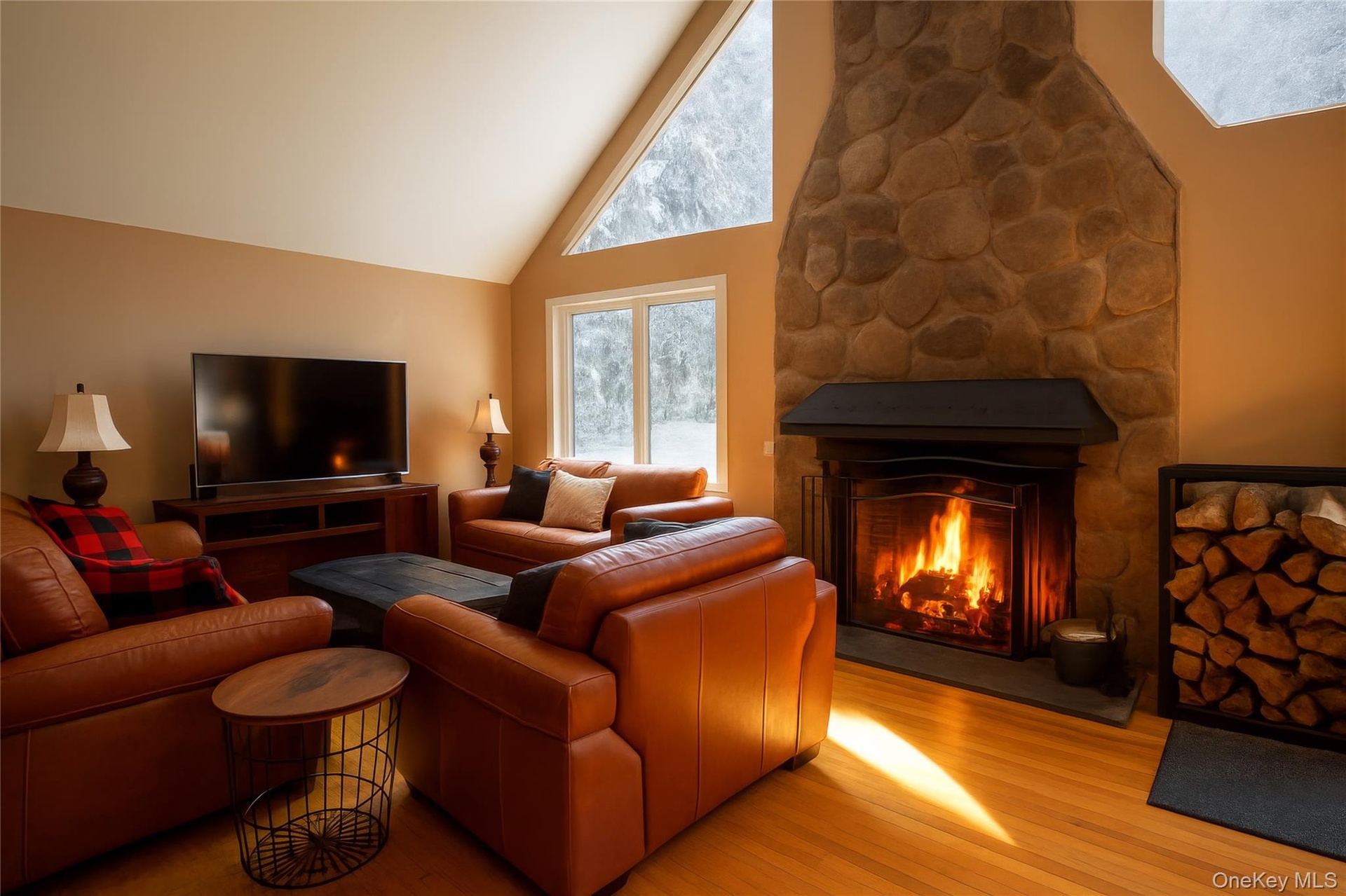 - Living area with a fireplace, wood finished floors, and high vaulted ceiling