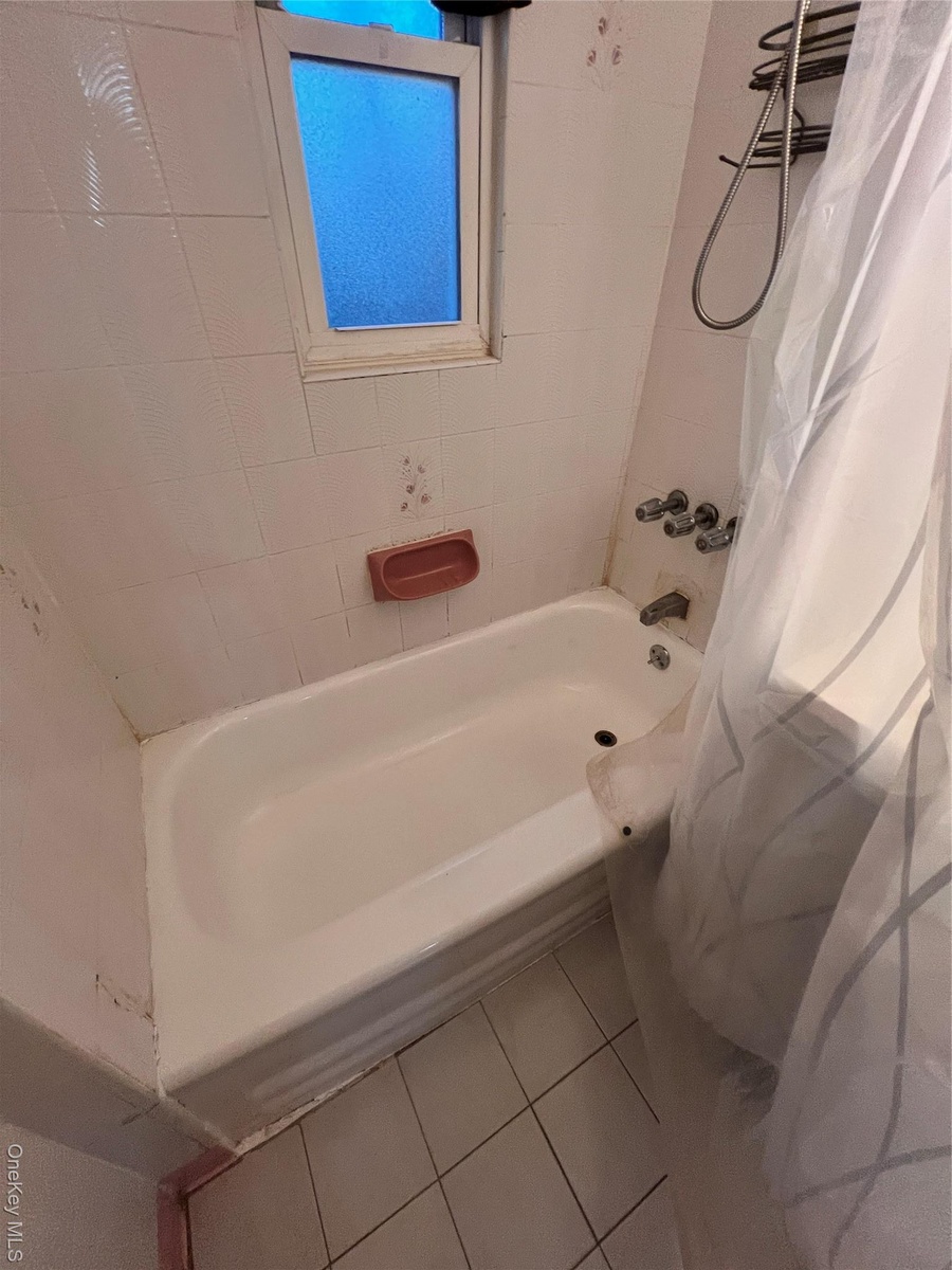 - Full bathroom with tile patterned flooring and shower / bath combo with shower curtain