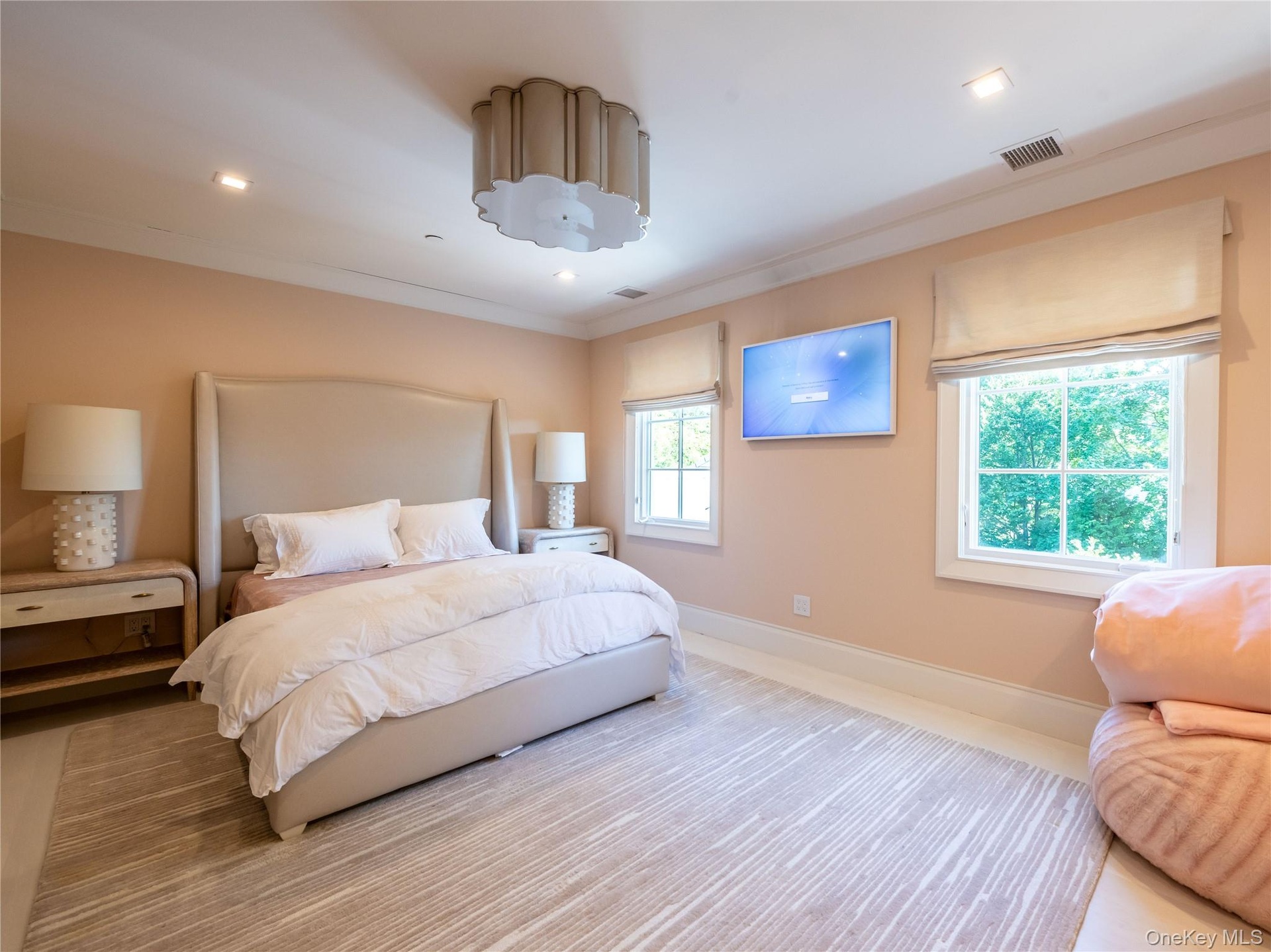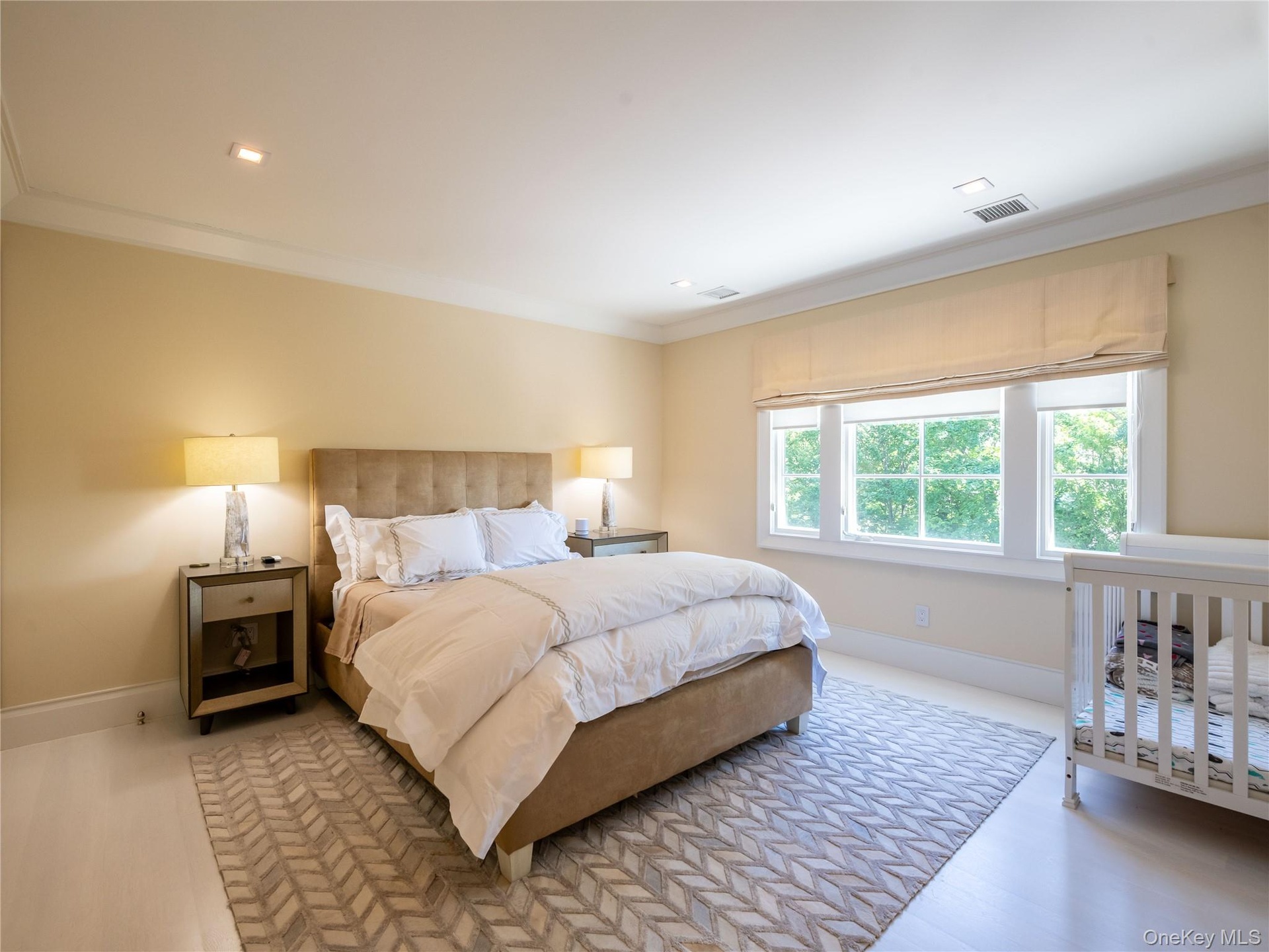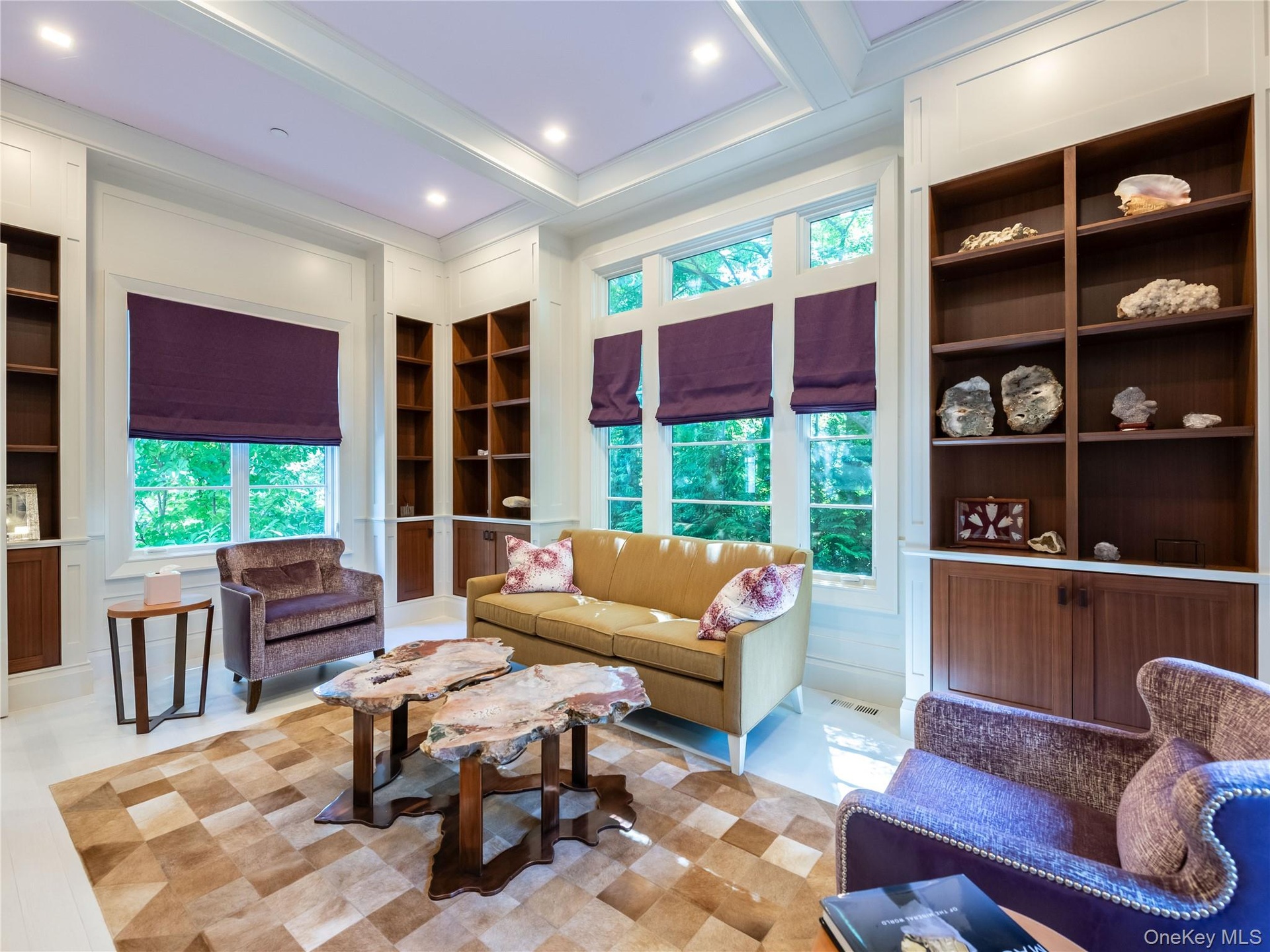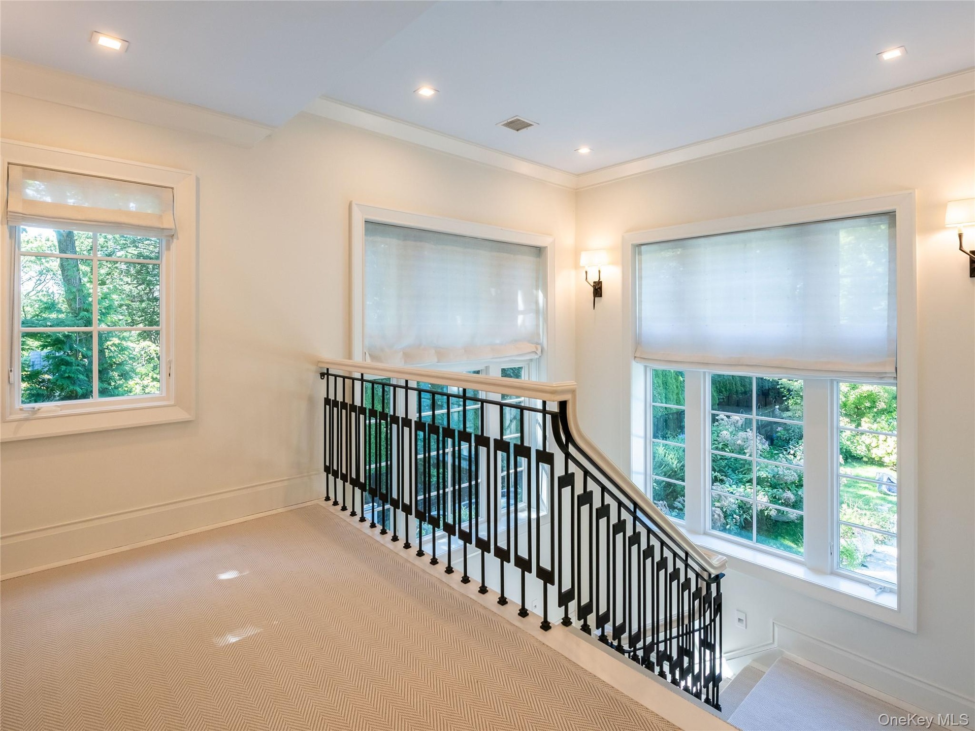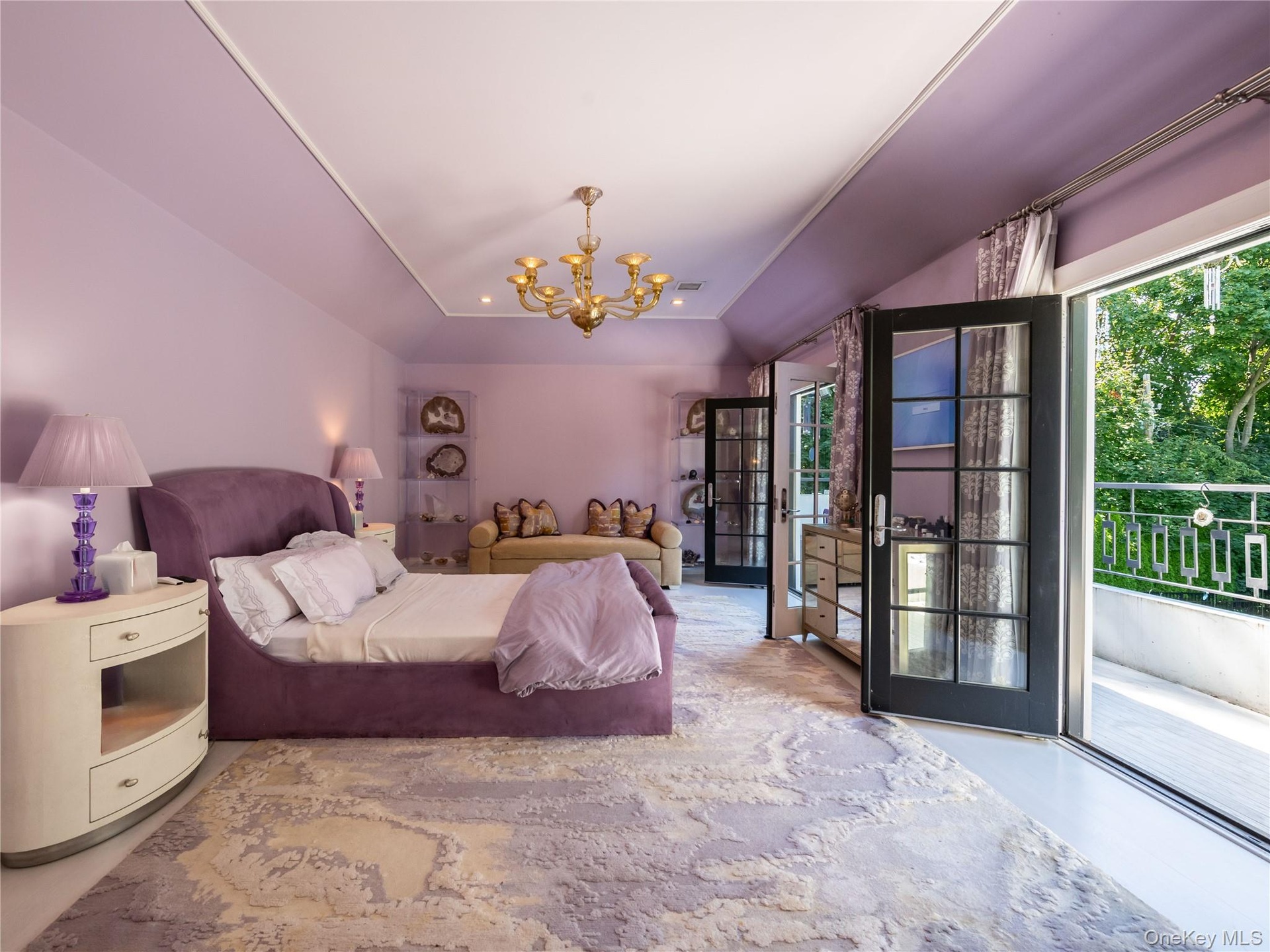 A striking custom staircase with bold geometric iron balustrades leads to the second level, which offers five bright ensuite bedrooms, each with distinctive tray ceiling designs. The luxurious primary suite features a spa-like bath with artistic mosaic tilework, a magical balcony with seasonal water views, generous custom closets, and the convenience of an upstairs laundry room.