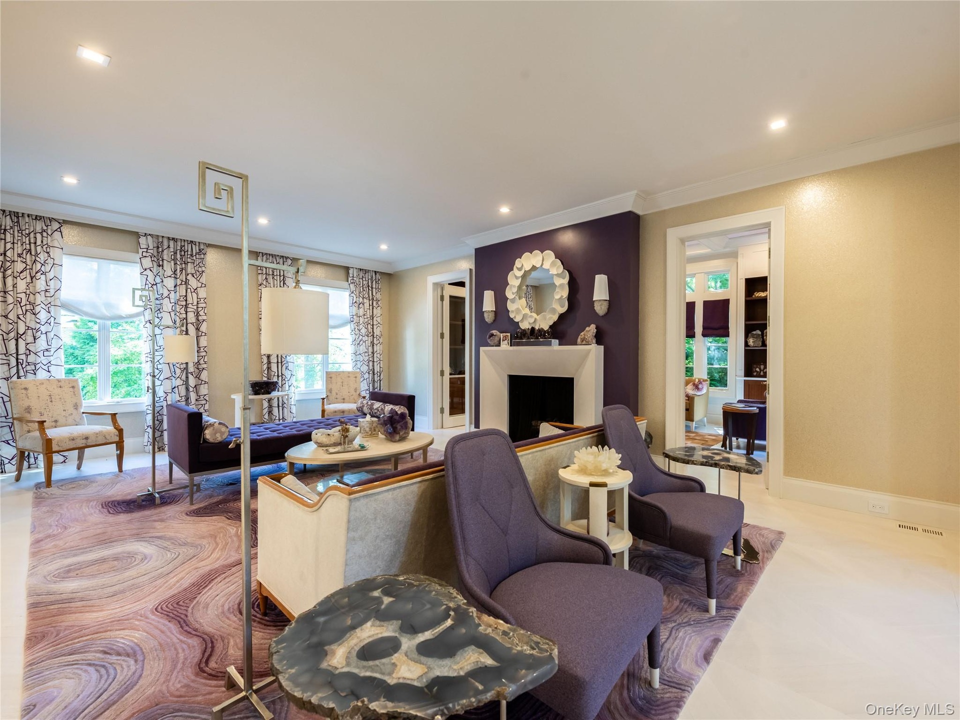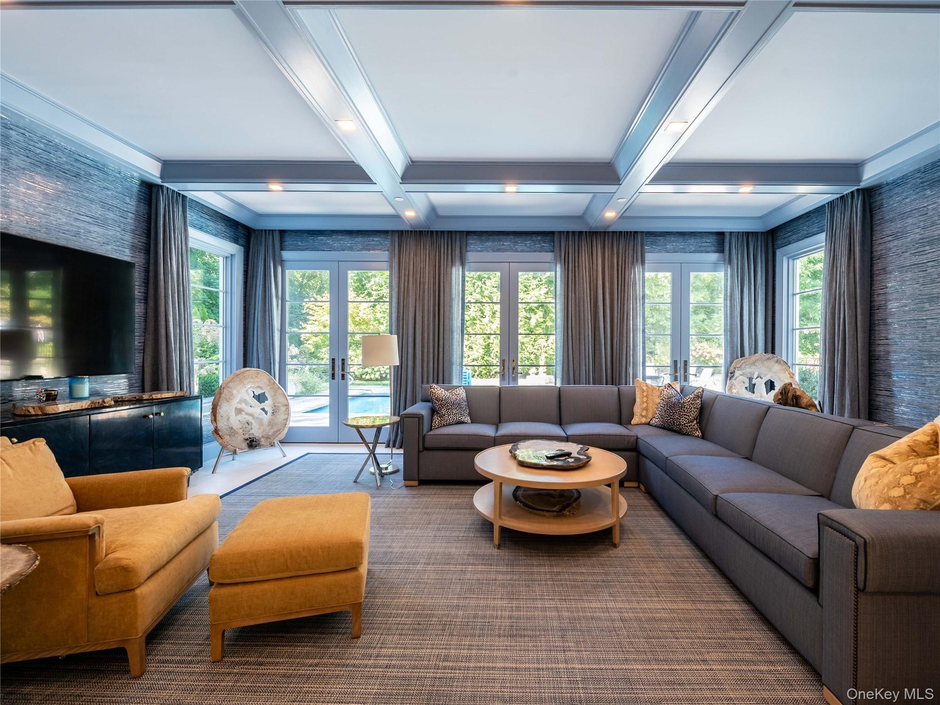 The chef’s kitchen is a true centerpiece, boasting marble counters, three Sub-Zeros, five ovens, an eight-burner stove, three Miele dishwashers, and a sunlit breakfast room overlooking the lush yard.