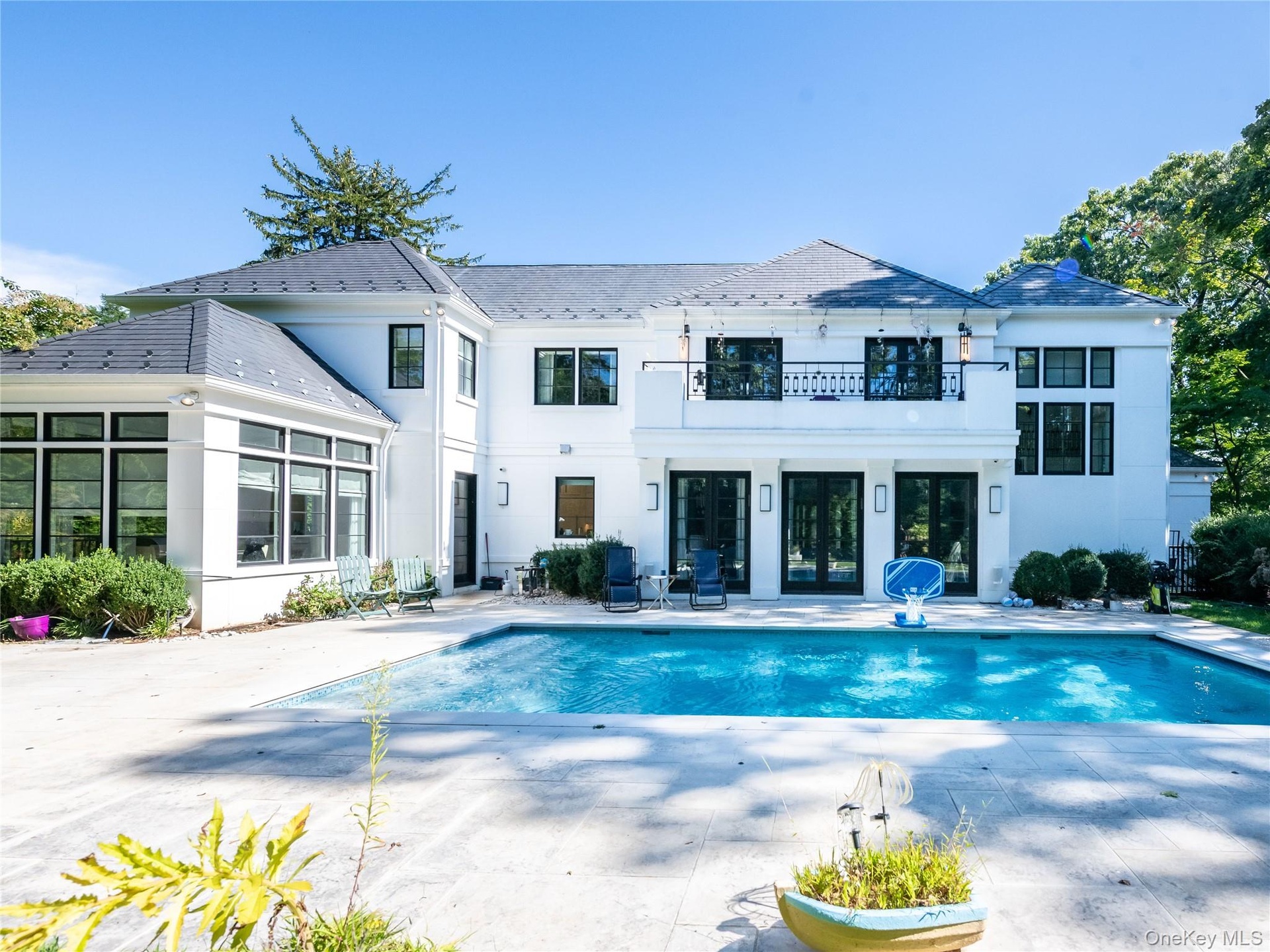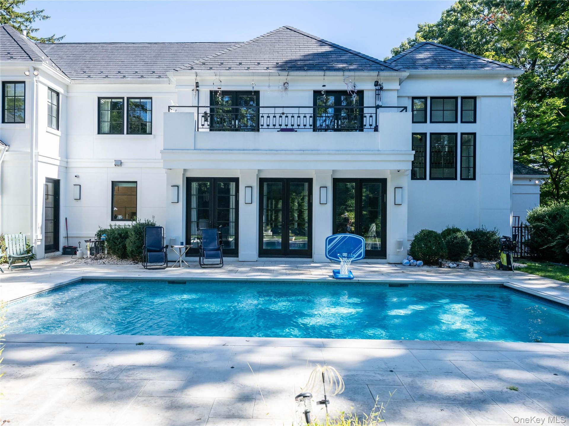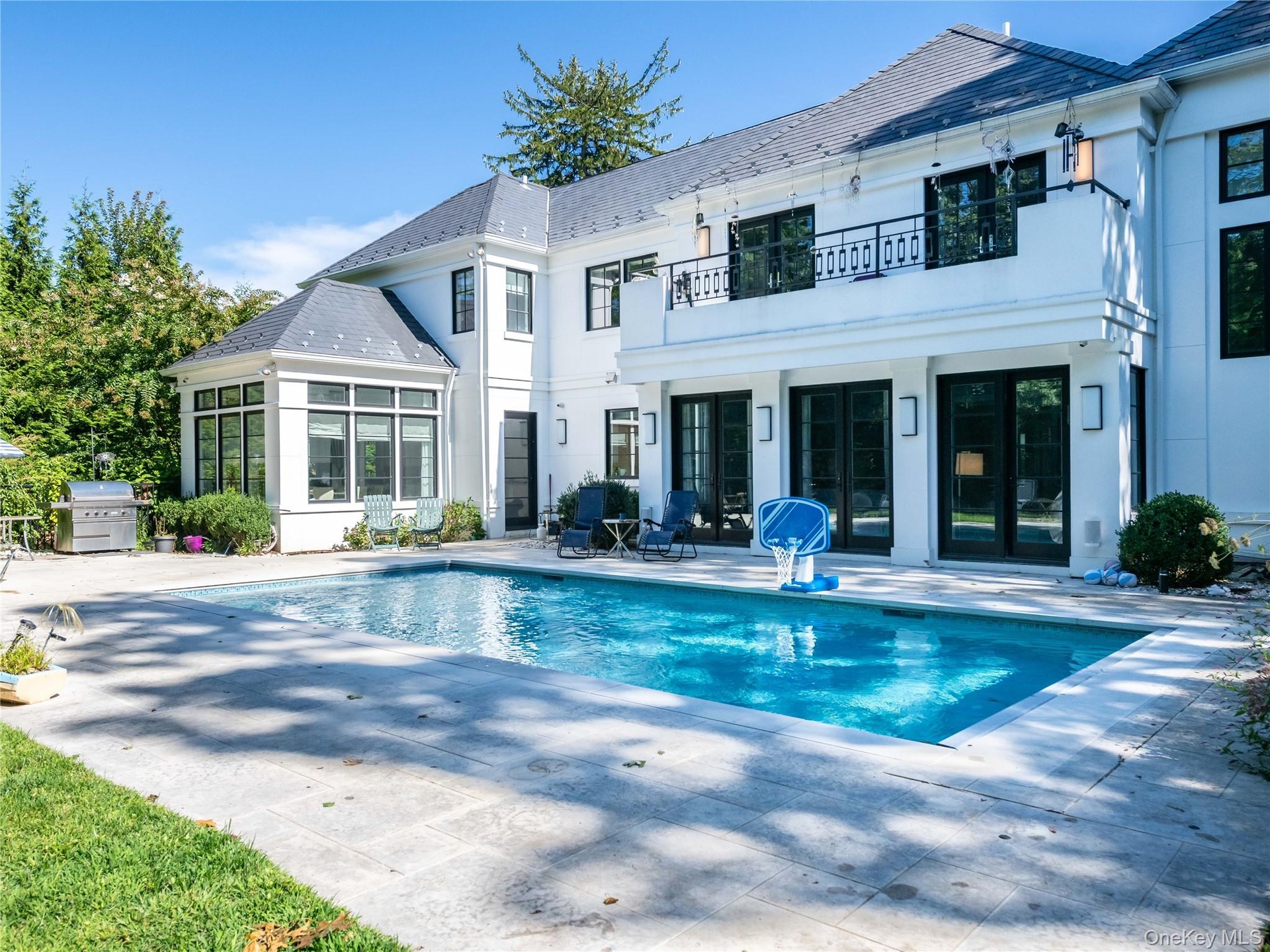 Additional features include radiant heat warming all stone floors throughout, a full-house generator, and an elevator shaft already in place for future installation. Outdoors, manicured landscaping and mature hedgerows provide privacy around the expansive bluestone terrace, lush lawn, and heated pool.