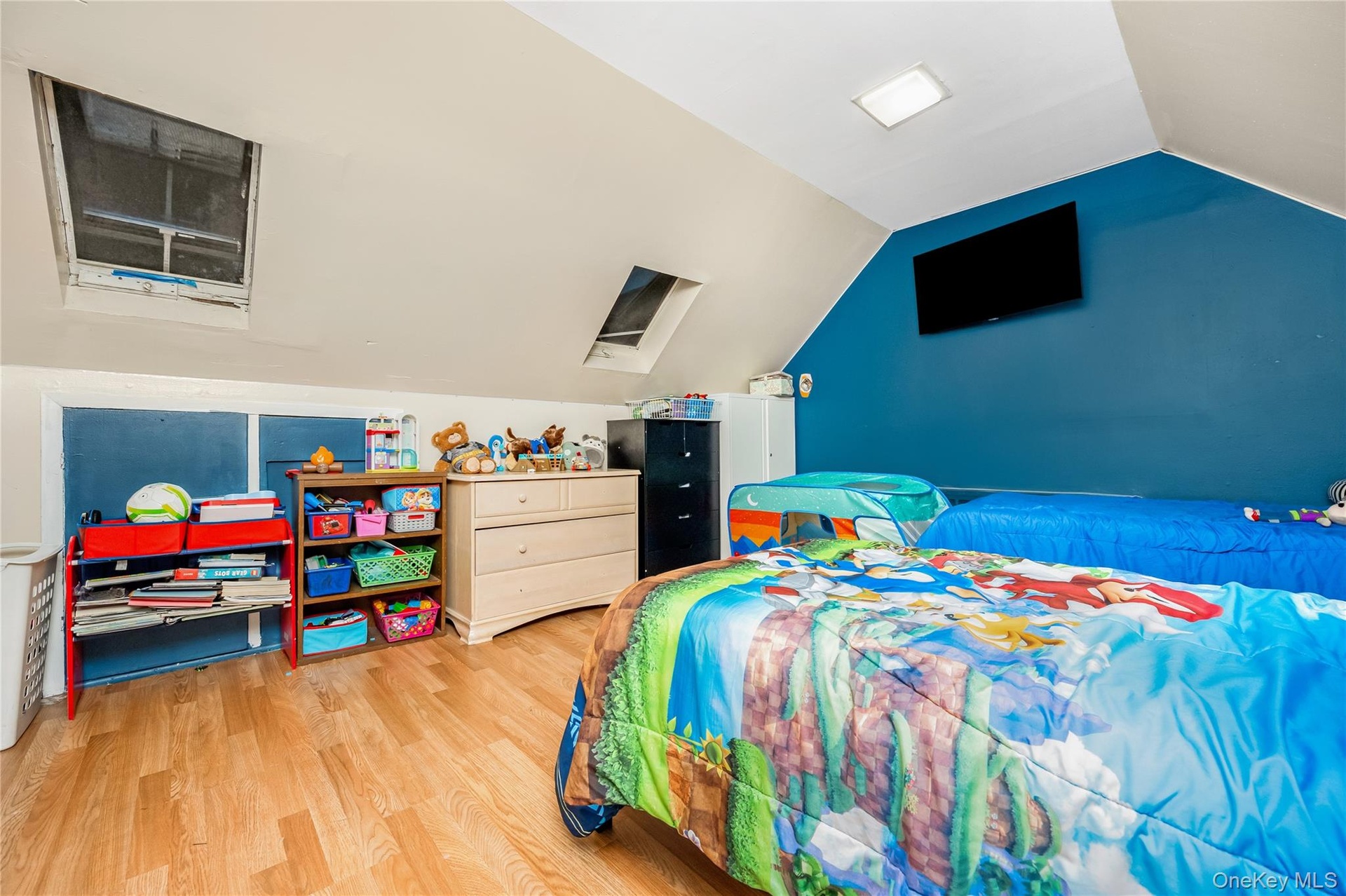 - Bedroom featuring light wood finished floors, vaulted ceiling, and a skylight