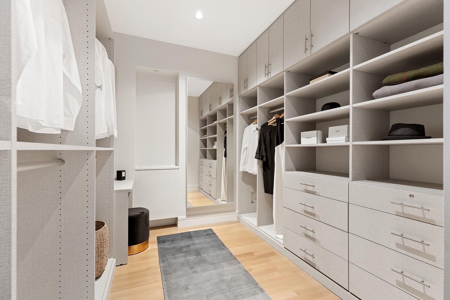 The spacious primary suite easily accommodates a king-size bed and features a walk-in closet customized by California Closets. The en-suite primary bathroom is beautifully finished with Sinuous Calacutta wall mosaic tile and Apollinara Crystalina marble floors, ensuring a spa-like experience within the comfort of your home. The second bedroom also comfortably fits a king-size bed and boasts its own en-suite bathroom adorned with Ann Sacks tile and honed marble floors, mirroring the luxurious finishes found throughout the apartment. All bathrooms are enhanced with radiant heated floors, adding that extra touch of warmth and luxury.