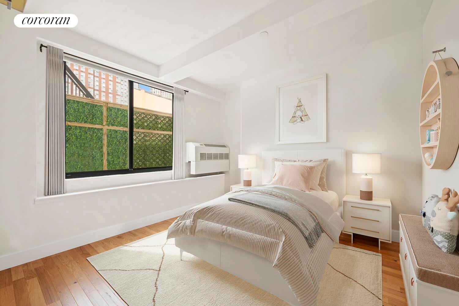This meticulously maintained Two Bedroom/Two Bathroom home boasts oak flooring throughout, beamed ceilings, a vented in-unit W/D and a wall of oversized windows overlooking the tranquil terrace. The split bedroom layout with a spacious living room easily accommodates both a dining set and living area. The chef's kitchen is spacious and modern and includes GE stainless steel appliances, dishwasher, Caesar Stone countertops and excellent cabinet space. The primary bedroom accommodates a king size bed plus furniture with an en-suite bathroom and ample closet space. The second bedroom is queen sized and set apart from the primary bedroom for optimal privacy while the second bathroom is in pristine condition.