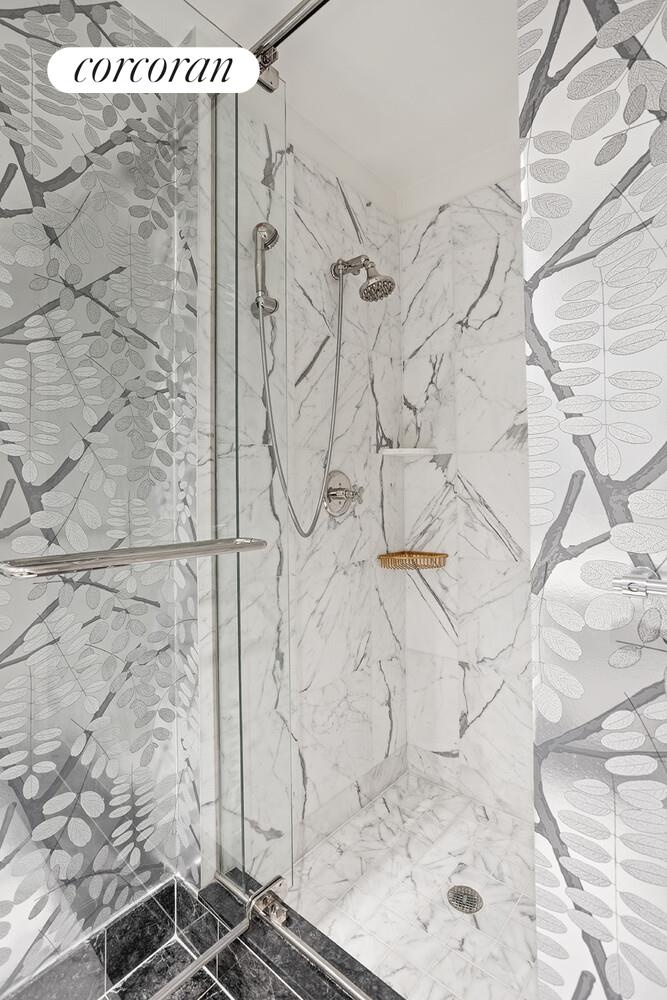 The second bedroom, adjacent to the Living Room, features nine-foot double doors opening into the living room, offering flexible use as a library, den, or a bedroom. The full bath with a shower, across the hall, can also be used as a powder room.