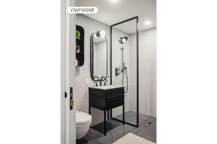 Residence 710 is a thoughtfully designed 706 sq. ft. alcove studio with southern exposure, filling the space with natural light and offering views of the Midtown skyline. Upon entry, a distinct alcove area separates the entrance from the main living space, enhancing functionality. The spacious galley kitchen features a striking marble countertop and backsplash, custom cabinetry with ample storage, and high-end appliances by Miele and Bosch-an uncommon luxury in studio residences. The elegant bathroom includes grey terrazzo flooring, pale grey ceramic wall tiles, a honed grey marble countertop, matte black Rohl fixtures, and a pocket door separating the shower from the vanity for added privacy. Every home at 547 West 47th Street offers modern conveniences, including an in-unit washer and dryer, central air conditioning, private storage, and motorized roller shades-creating the ideal urban retreat.