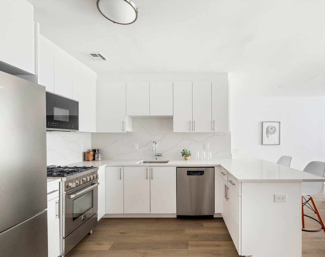 The king-sized bedroom is bright and spacious, with a large closet. The newly renovated bathroom features porcelain tile and a sleek, glass-enclosed shower with modern fixtures. Incredible storage, a brand-new Bosch washer and dryer, and new hardwood floors throughout complete this stunning Chelsea loft.