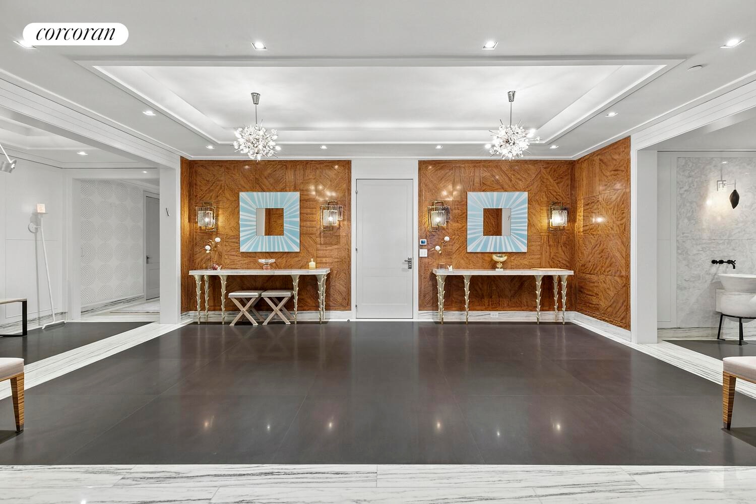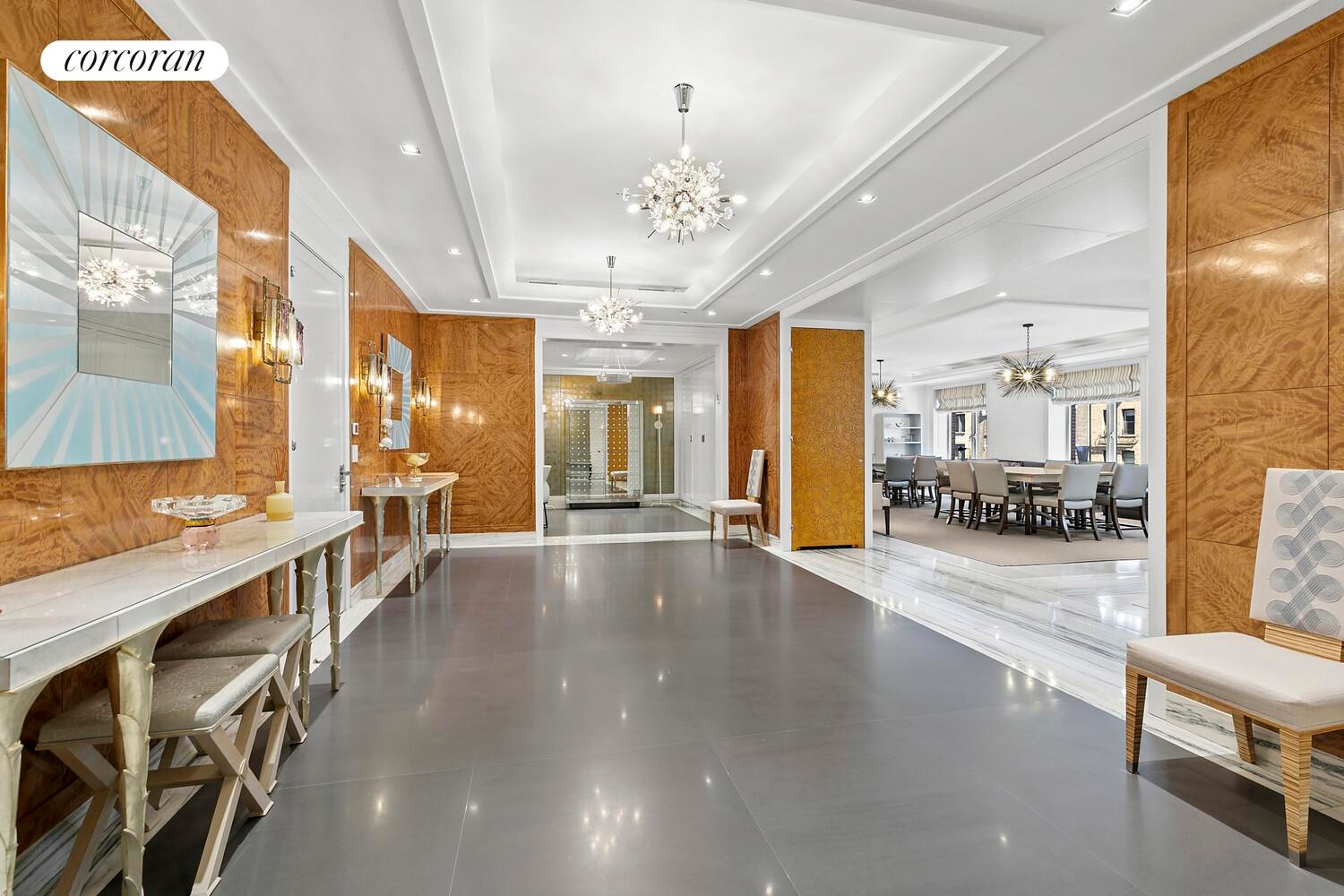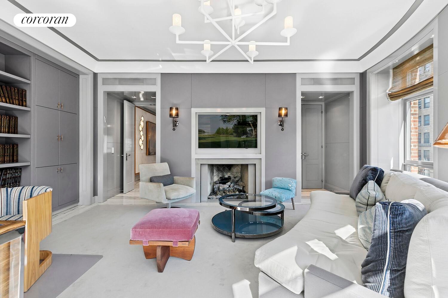 From your private elevator vestibule , enter a stately 30-foot gallery that introduces a home of grand scale and exceptional design. The 55-foot great room is bathed in natural light through five oversized north-facing windows and anchored by elegant proportions ideal for both formal entertaining and relaxed daily living. A corner library with gas fireplace and custom leather-wrapped millwork offers a quiet retreat of warmth and sophistication.