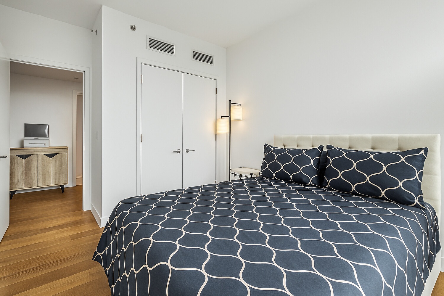 The king-sized bedroom offers a peaceful escape with generous closet space, while the spa-like bathroom is wrapped in Italian marble tile and finished with a floating vanity, matte black fixtures, and radiant heated floors - a luxurious everyday indulgence.