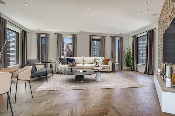 The layout is phenomenal for entertaining, with a gracious, open kitchen designed by Boffi featuring Italian lacquer cabinetry, modern built-in Sub-Zero, Liebherr, Bosch and Miele appliances, and brand new Quartz countertops, island and breakfast bar overlooking a massive 36-foot long Great Room. Surrounded with windows, it doesn't matter which direction you turn - you are treated to a different angle of surreal downtown, uptown and river views.