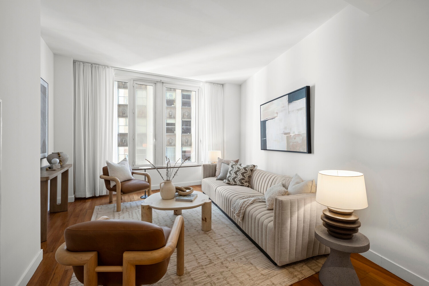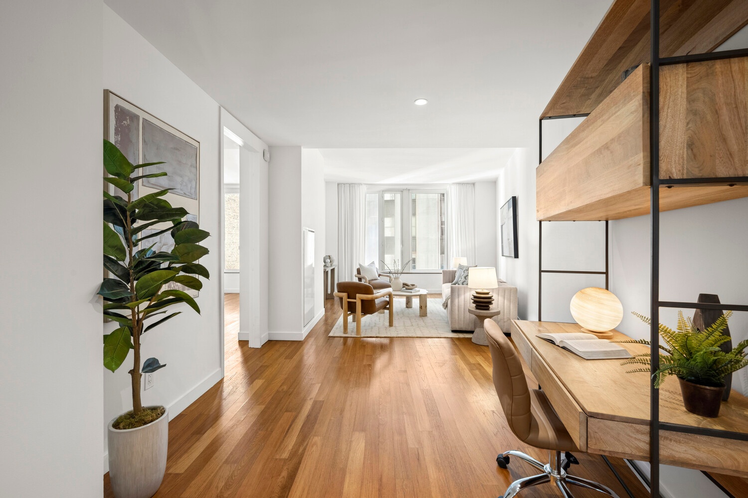 Introducing Residence 15H - the highly sought-after H-line, a sprawling 2-bedroom, 2-bathroom home offering over 1,300 sq. ft. of thoughtfully designed living space. Soaring ceilings, 3.5" Burmese teak floors, and oversized double-glazed plate glass windows with modern horizontal shades create a bright and airy atmosphere, while individual climate control in each room ensures year-round comfort.