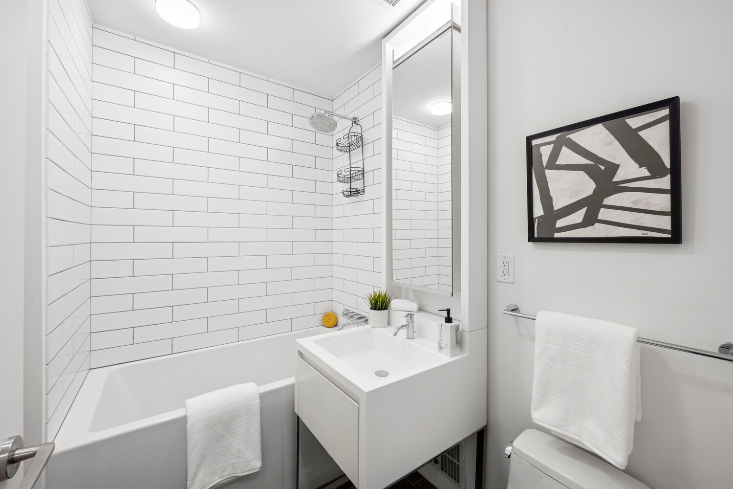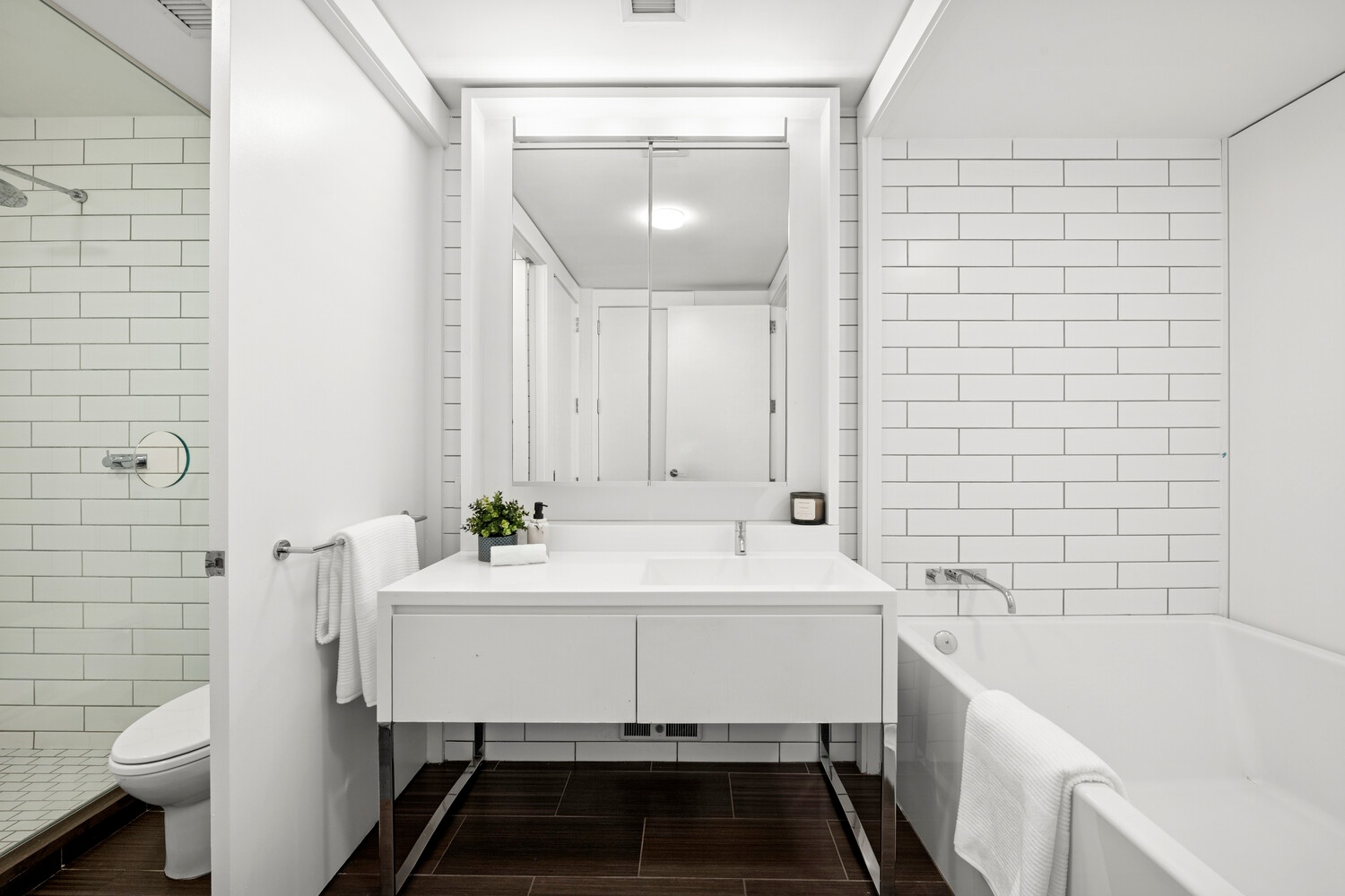The spa-inspired bathrooms are designed with full-height adjustable louvered doors, a separate shower and water closet, a custom cantilevered Corian vanity with mirror surround, and a deep soaking tub. Completing this exceptional residence are a spacious walk-in closet and the convenience of an in-unit washer/dryer.