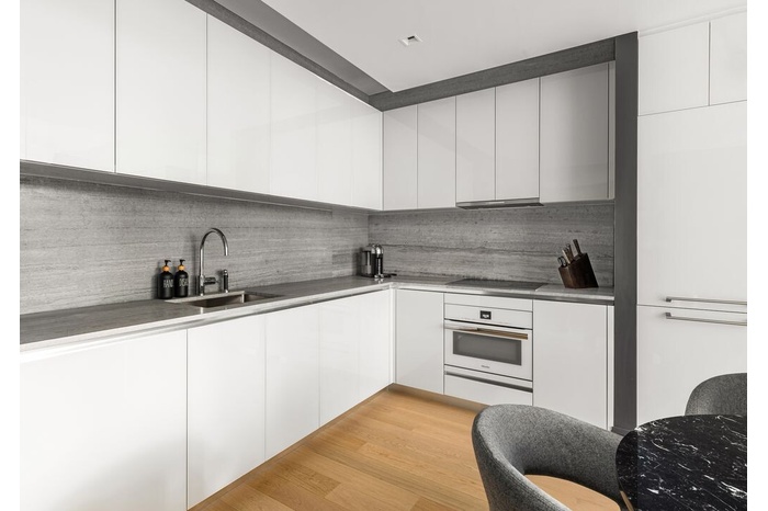 Kitchens provide seamless technology coupled with classic elegance. No expense was spared when outfitting One Wall's kitchens: from the best in class Miele appliances to the externally-venting exhaust to the insinkerator garbage disposal, these chef-styled kitchens are the perfect blend of beauty and function.