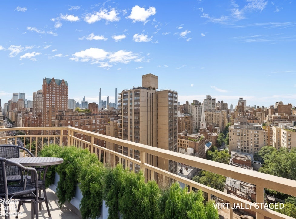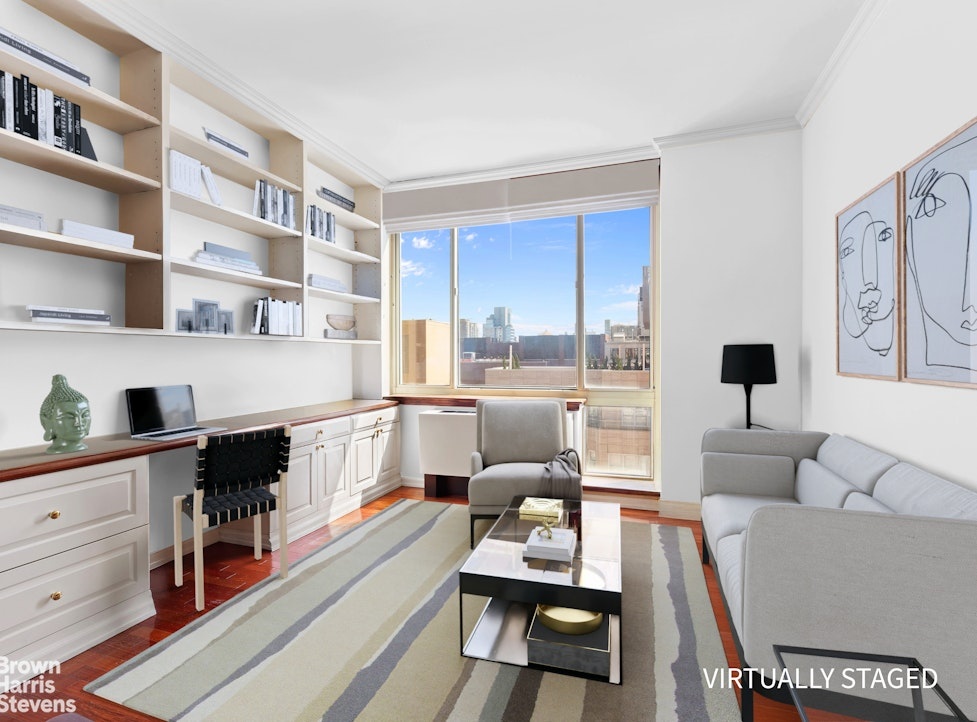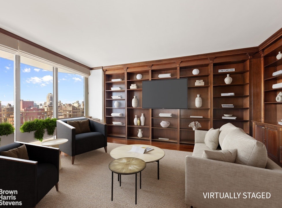 -The heart of the apartment is the living room, dining room, and den/library, which feature high ceilings and wooden floors. Two balconies and walls of windows face south and west, offering views of Central Park, Billionaire's Row, and the NYC skyline.