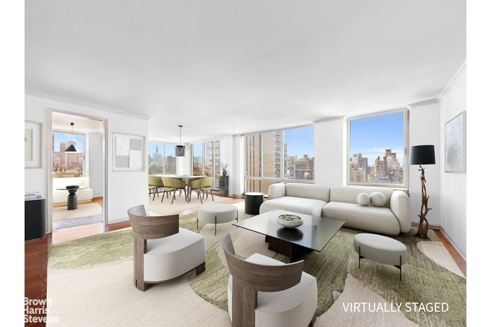 A private elevator vestibule opens into a 35-foot gallery-style foyer in this gracious home of approximately 3500 SQFT, which features high ceilings, brilliant light, and city views from every room.