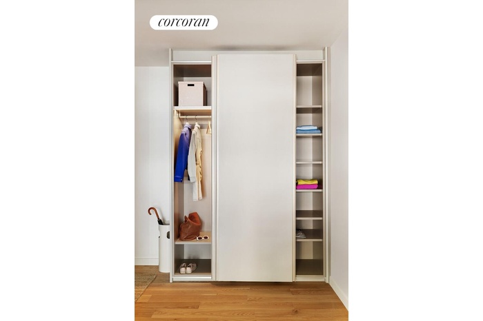 Residence 523 is a thoughtfully designed 670 sq. ft. one-bedroom home with bright western exposure, filling the space with natural light throughout the day. The entry foyer leads to a sleek, open kitchen featuring dramatic marble countertops and backsplashes, custom cabinetry with ample storage, and premium appliances by Miele and Bosch. The king-size primary bedroom offers a serene retreat, complete with a beautifully appointed en-suite bathroom showcasing grey terrazzo flooring, soft grey ceramic wall tiles, a honed grey marble countertop, a custom matte black vanity, and matte black fixtures by Rohl. Additional features include an in-unit Bosch washer and dryer, central air conditioning, motorized roller shades, and private storage-making this home a refined and tranquil urban sanctuary.