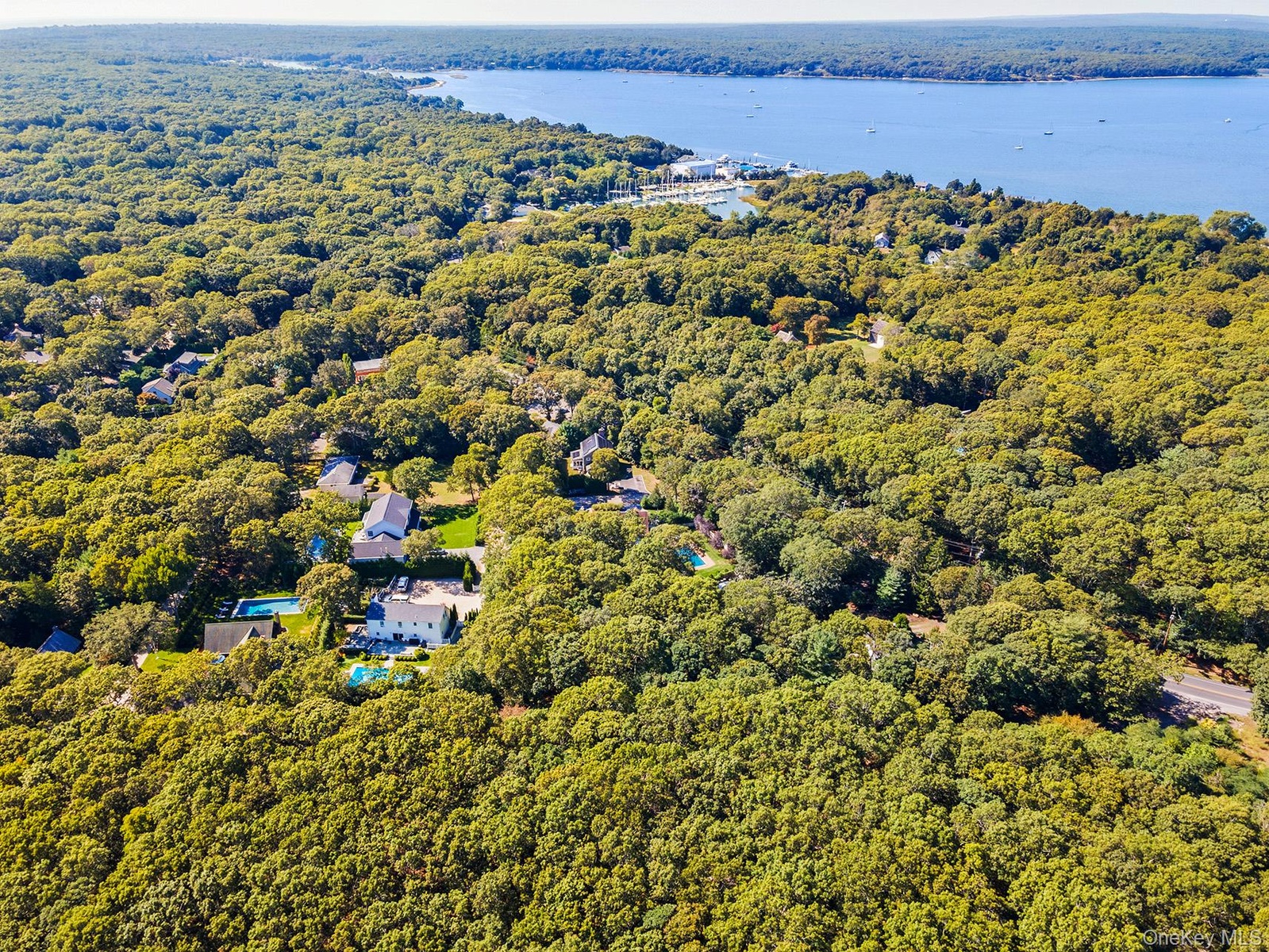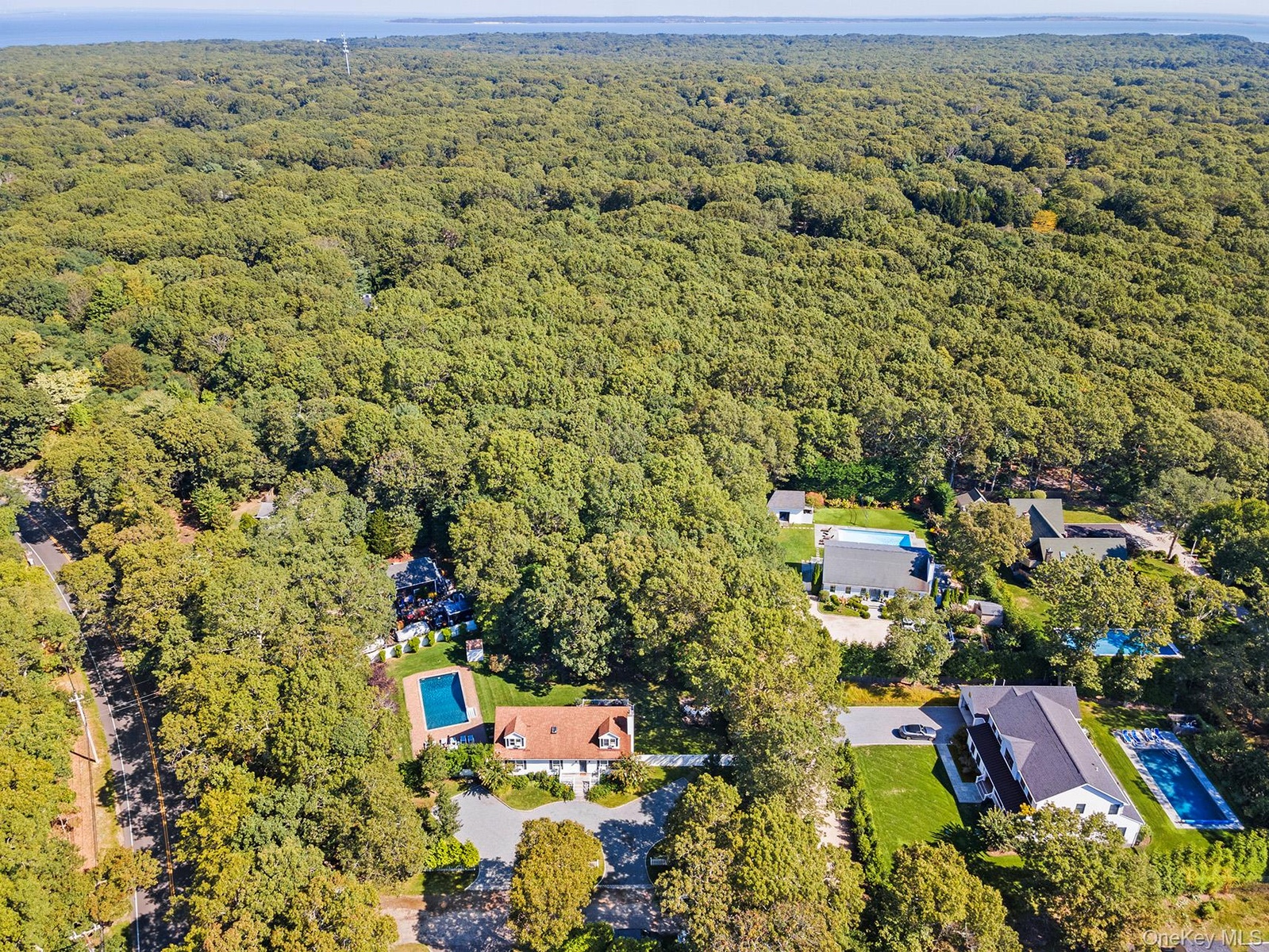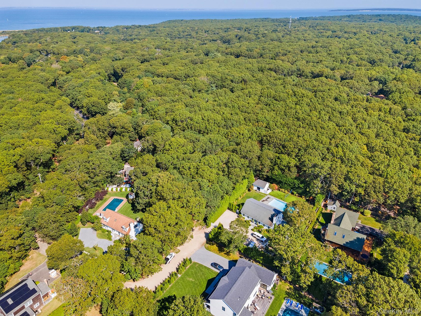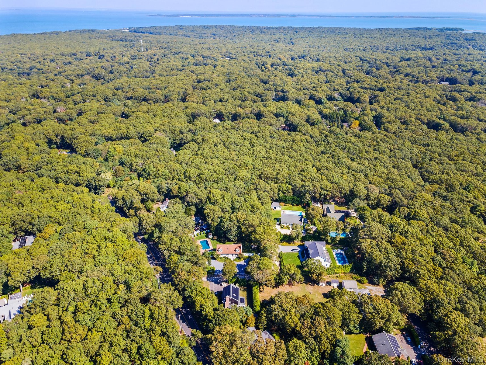 - Drone / aerial view of a heavily wooded area and a large body of water