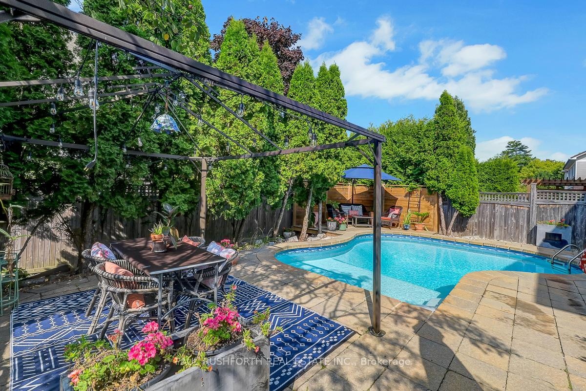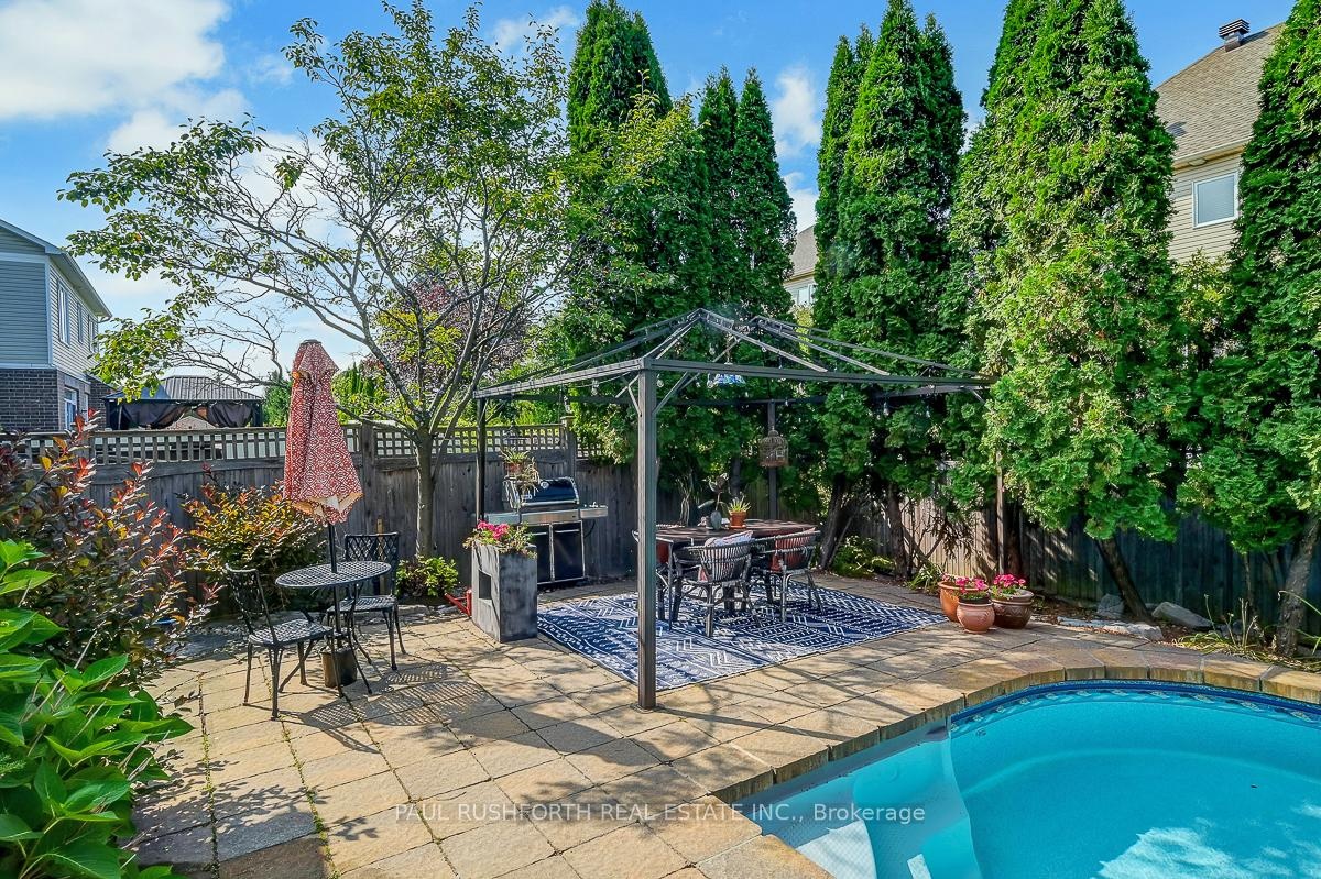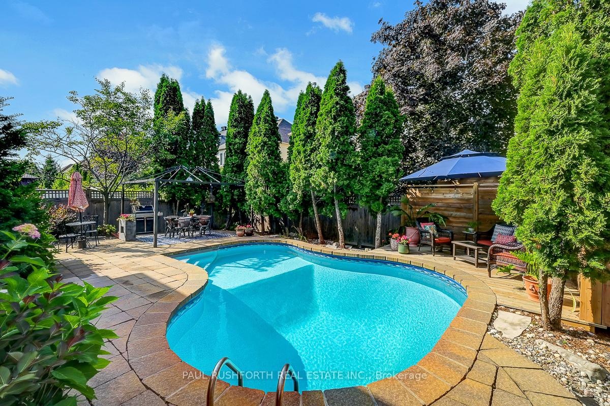 Elegant 4+1 Bedroom Family Home with Backyard Oasis in Chapel Hill South! Nestled on a quiet street, this beautifully appointed home offers exceptional living inside and out. With its inviting front veranda, tasteful interlock, and classic curb appeal, this home is designed to impress.The main level is ideal for both formal and casual living, featuring distinct living and dining rooms, a cozy family room adjacent to the kitchen, and a main floor den perfect for working from home. The gourmet kitchen blends warmth and luxury with its custom millwork, built-in appliances, and an eye-catching social centre island, a space where everyone will gather. Upstairs features hardwood floors throughout, four generously sized bedrooms, a modern main bathroom, and a luxurious primary suite complete with a 5-piece ensuite featuring a floating double vanity, glass shower, and a freestanding tub that invites relaxation.The finished basement expands your living space with a large rec room and convenient 2-piece bath, ideal for movie nights, a home gym, or play area plus a 5th bedroom.Step outside to your private backyard oasis, where summer living takes center stage. Enjoy the inground pool, interlock stone patio, and ample space for BBQs and entertaining.This is a home that truly checks all the boxes; style, space, and location. Don't miss your opportunity to call it yours!