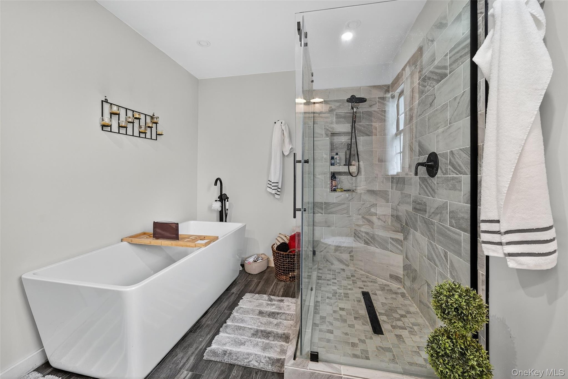 Upstairs, the renovated primary suite features a spa-style bath with soaking tub and walk-in shower, plus two more bedrooms, another full bath, and a bonus room with walk-up attic access. A full basement leads directly into the attached two-car garage.