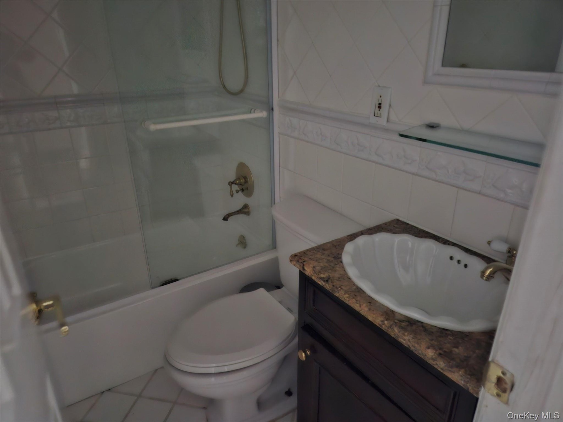 - Full bath featuring tile walls, tile patterned flooring, and bath / shower combo with glass door