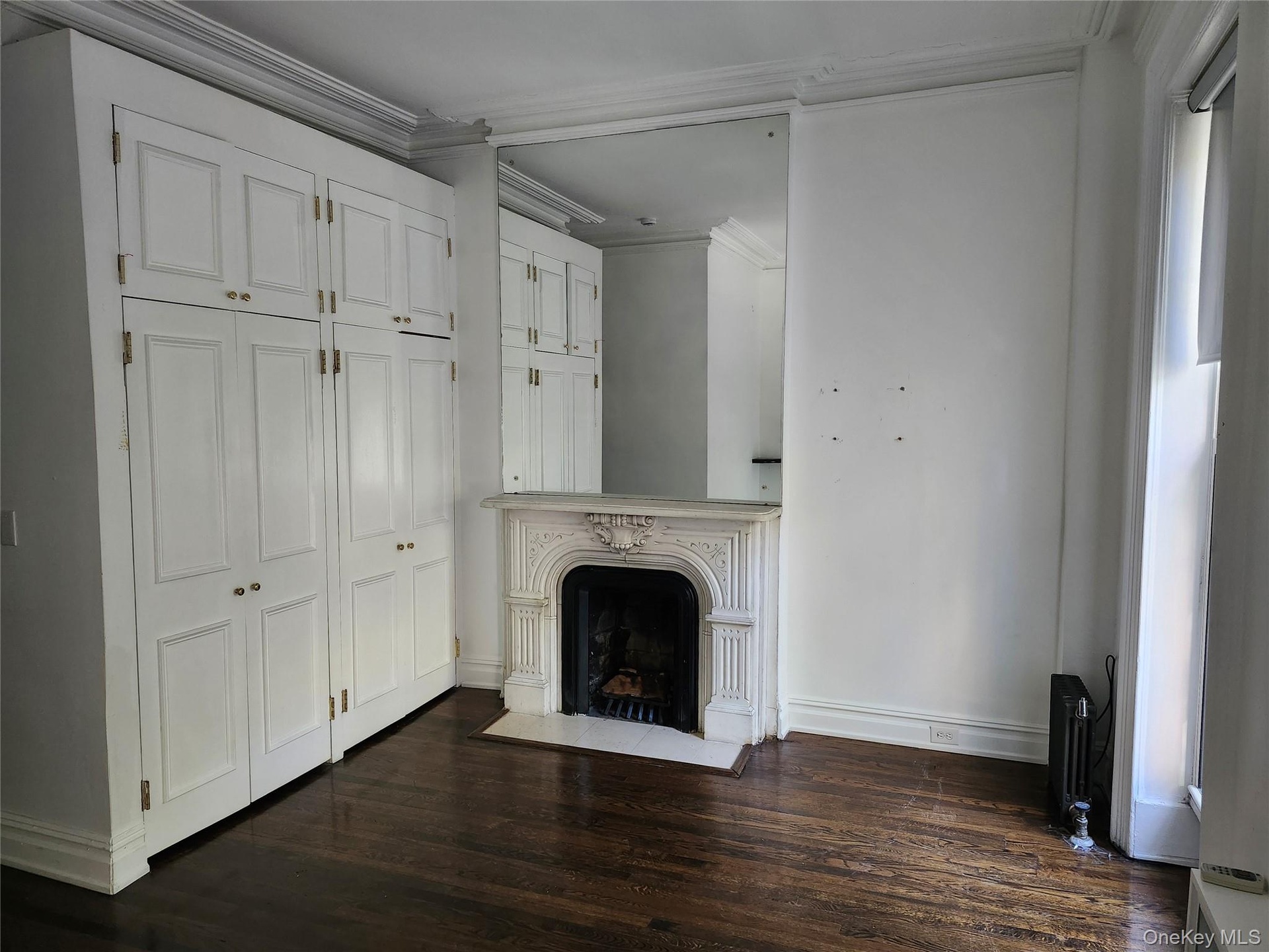 - Unfurnished bed room featuring dark wood-style floors, a fireplace with flush hearth, and ornamental molding