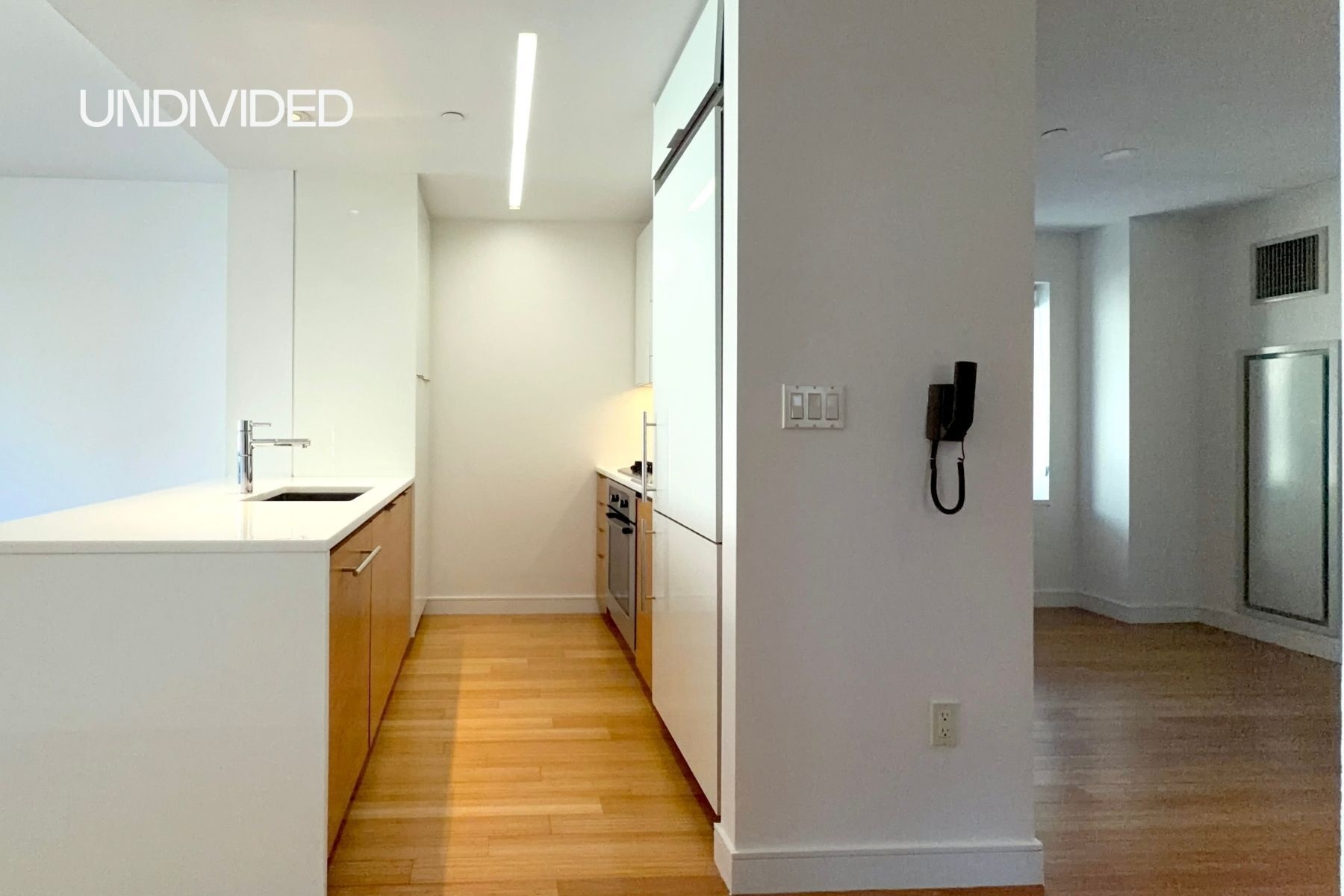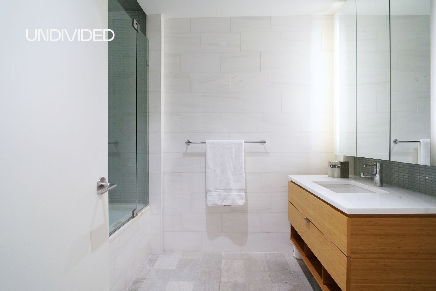 Residence 6F at 303 East 33rd Street offers approximately 874 square feet of modern, corner living with bright, north and east exposures. It is a one bedroom plus den, which can also be used as a home office. The eco-friendly bamboo flooring throughout adds warmth while the bright white finishes sets a modern tone. It has an open kitchen with a large island and custom bamboo cabinets. State of the art appliances include Bosch dishwasher, oven and cook top, and Liebherr Refrigerator. The spa-like bathroom has Bianco Dolomiti white marble walls, quartzite floors and glass wall tiles in the bath/shower. The custom bamboo vanity has extra storage features. The apartment also has a Bosch washer and dryer. The large bedroom has a walk-in-closet.