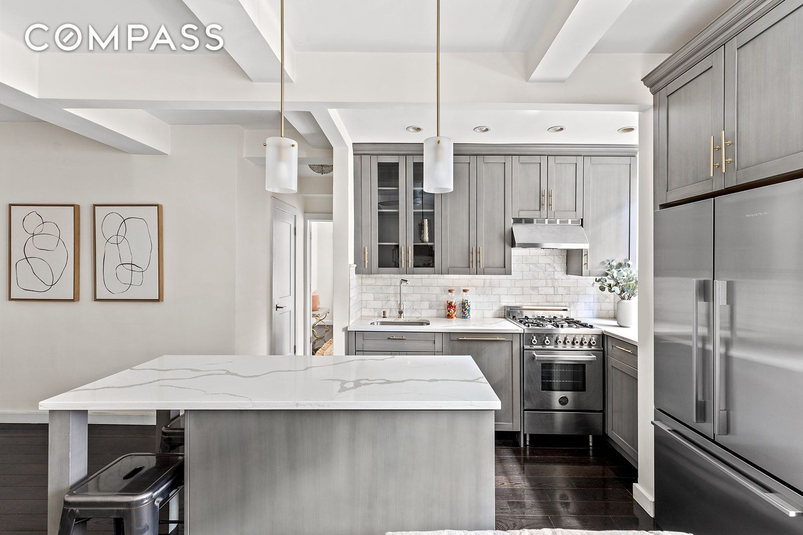 As you enter the foyer, you are immediately drawn to the beautiful dark hardwood flooring and open layout, perfect for entertaining. The renovated open kitchen features an island, stainless-steel appliances, Bertazzoni gas oven, Bosch dishwasher, quartz countertops and custom cabinets. The living room is spacious enough to have additional dining seating and a desk to work from home! The renovated windowed bathroom features marble tile and glass shower doors. The spacious bedroom is large enough for a king size bed and plenty of additional furniture. Additional property features include a water filtration system, Lutron dimmer switches and a total of 6 large closets!