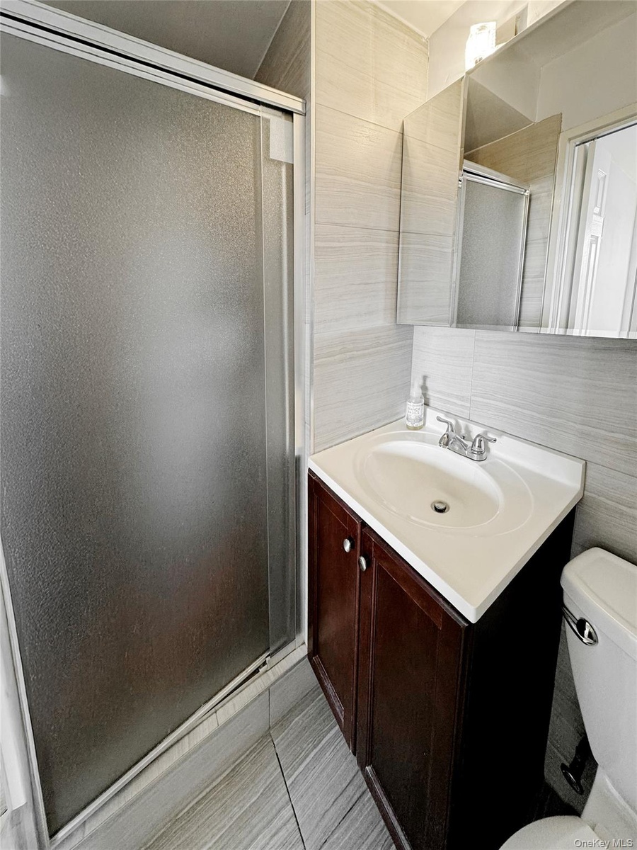 - Full bathroom featuring vanity, a stall shower, light tile patterned floors, and tile walls