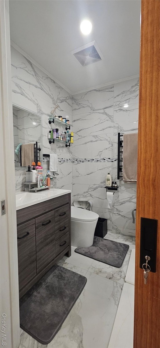 - Full bathroom featuring tile walls, light marble finish floors, vanity, a towel warming rack, and crown molding
