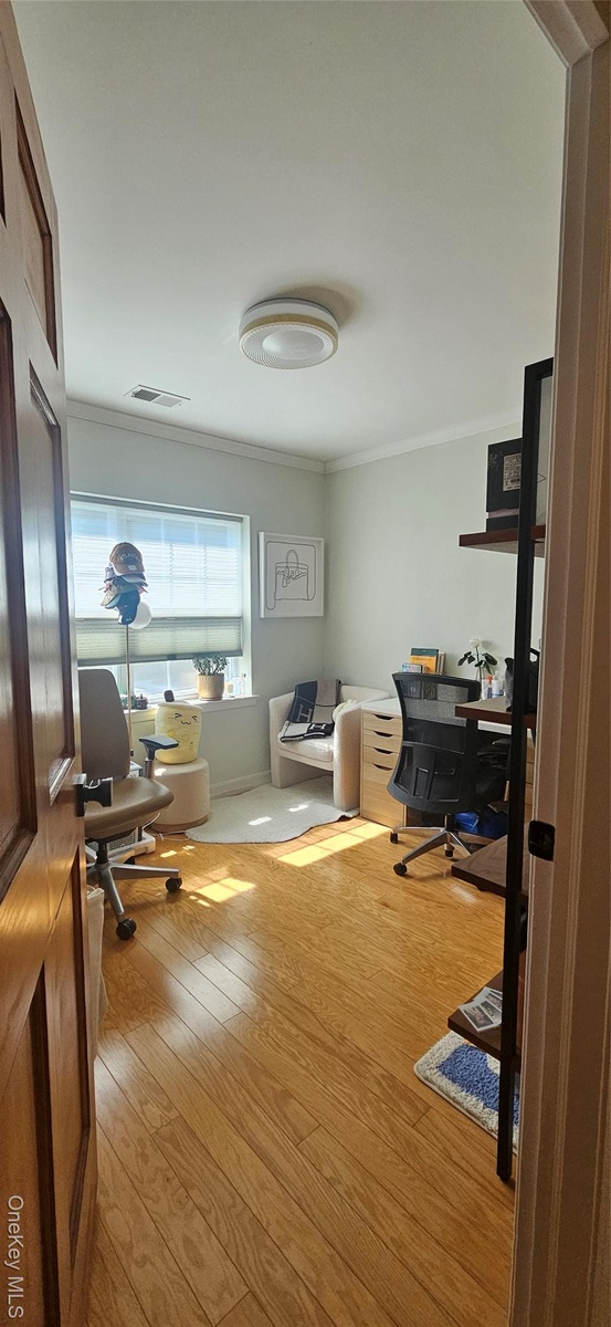 - Living room featuring light wood finished floors, ornamental molding, and recessed lighting