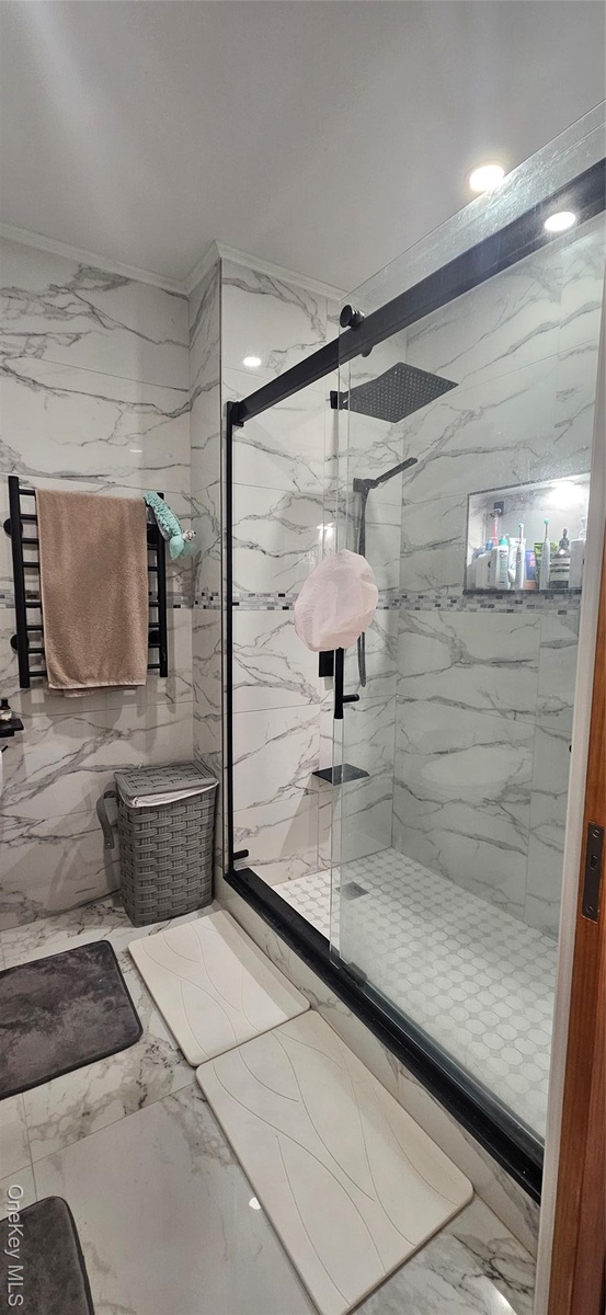 - Full bathroom featuring marble finish flooring, a marble finish shower, a towel warming rack, and tile walls