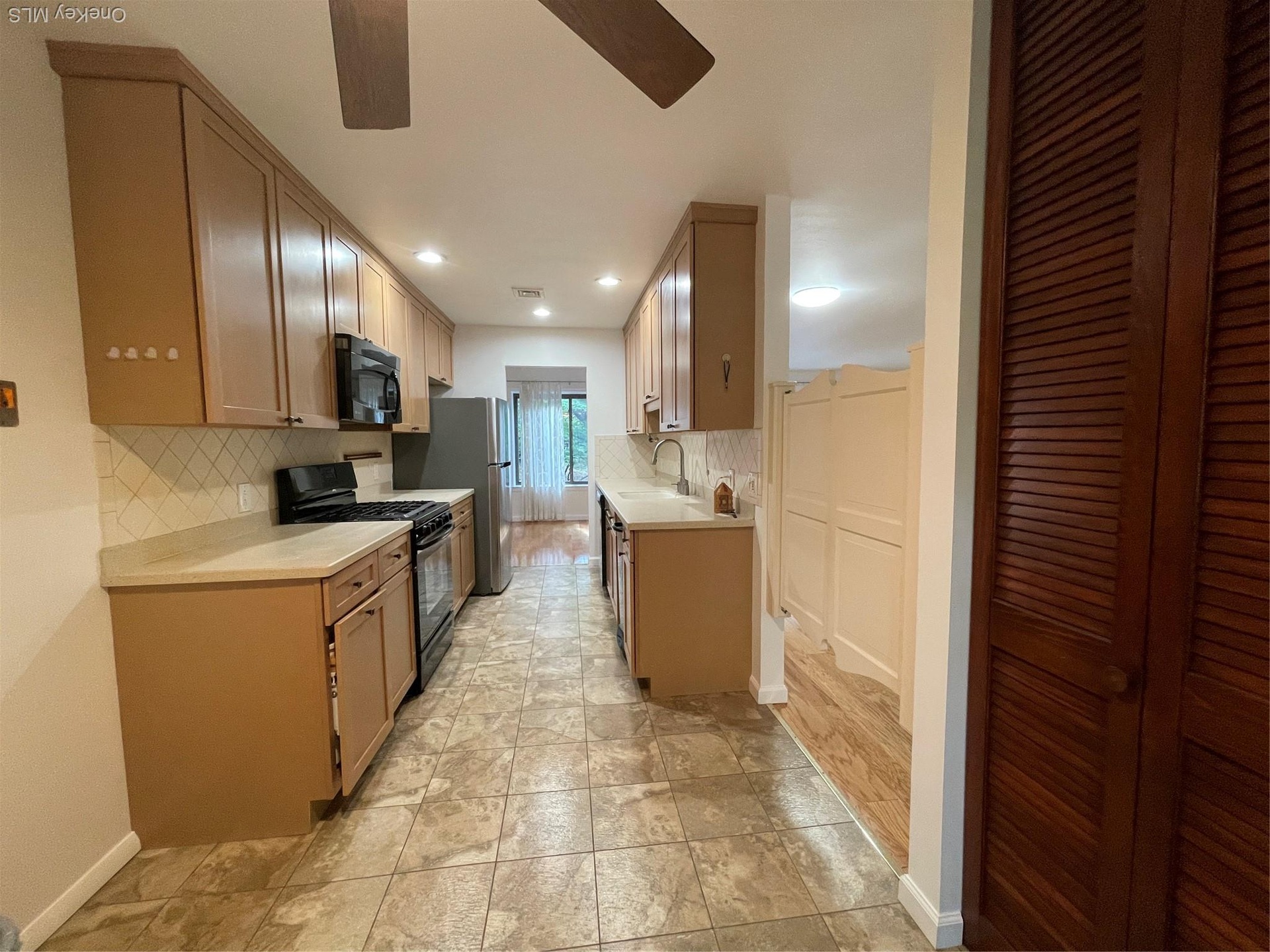 - Kitchen featuring tasteful backsplash, range, brown cabinetry, ceiling fan, and recessed lighting