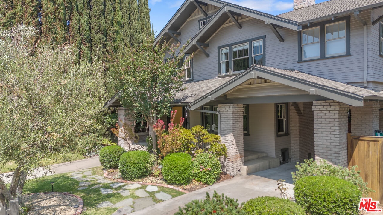This stunning Craftsman blends original character with thoughtful modern updates. Step into the spacious living room, filled with rich wood trim and timeless charm. The formal dining room features wood-beamed ceilings and classic wainscoting, opening seamlessly to a cozy den, a breakfast room, and a beautifully updated kitchen with an island and modern appliances. A walk-in pantry, laundry/storage room, and a convenient half bath complete the main floor. Upstairs, a charming staircase leads to the large primary suite with a gorgeous new bathroom featuring double sinks and access to a private rooftop deck. Two additional guest bedrooms share a character-filled hall bath, and there's a versatile playroom, office, or optional fourth bedroom.The backyard is an entertainer's dream with a covered dining patio overlooking the private garden. The detached garage (an additional 500 sq.ft.) has been converted into a flexible office, playroom, or hobby space, with an attached gym. Property has been updated with newer central air and heat, copper plumbing, and electrical. Nestled on a picturesque tree-lined street surrounded by beautifully restored homes, this is a rare opportunity to own a true piece of architectural history (HPOZ). Active neighborhood community with yearly Halloween party.