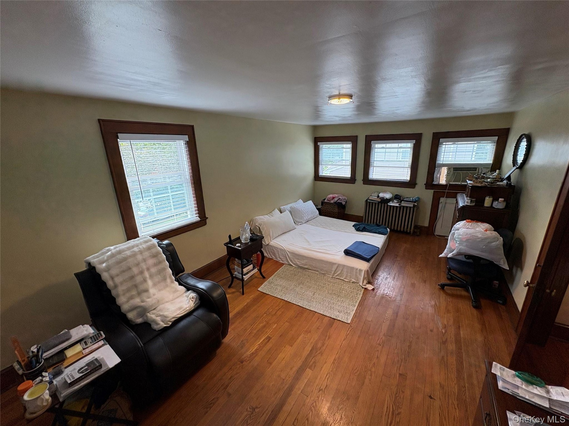 - Living room with wood finished floors, radiator heating unit, and plenty of natural light