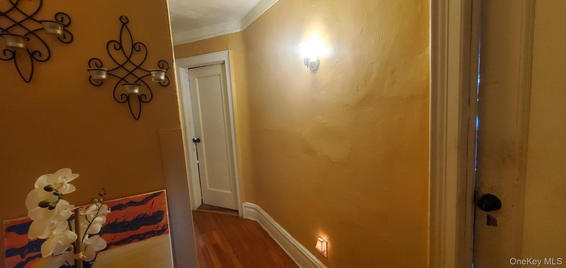 - Hallway featuring wood finished floors and crown molding