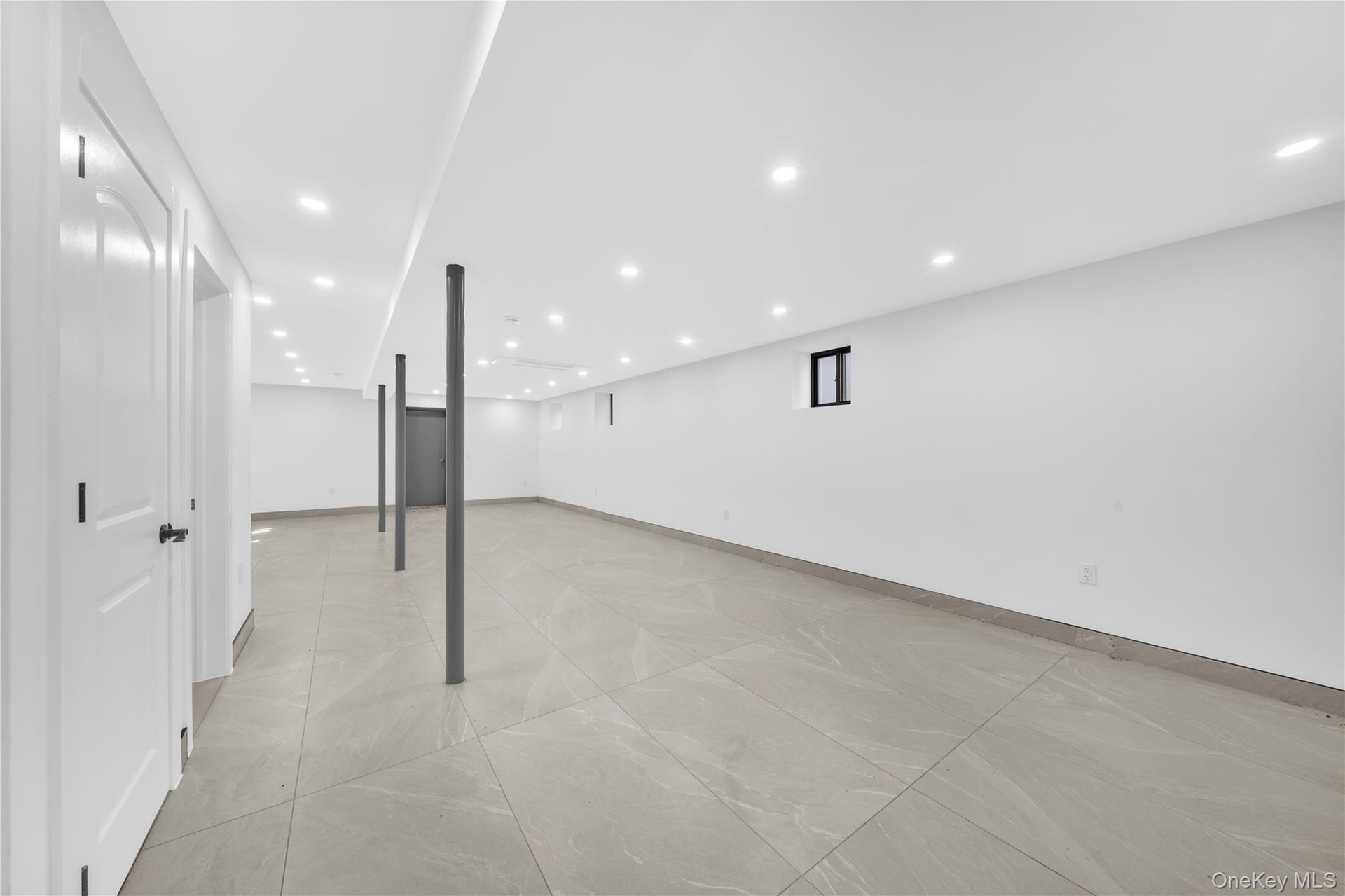 - Finished below grade area with recessed lighting and light tile patterned flooring