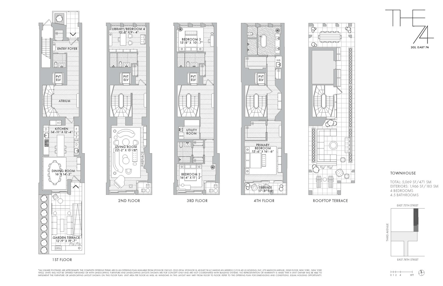 Having it all begins here, with the rare and singular modernist masterpiece Townhouse offering at THE 74 discreetly situated on a coveted block of Manhattan's fabled Upper East Side. With the privacy and exclusivity of a standalone, new construction townhome and the services and amenities of a white-glove condominium, the best of both worlds come together in renowned Pelli Clarke & Partners" first ever townhouse. Behind a white glazed terracotta facade, the glass-wrapped and light-filled four stories comprise 5,069 interior square feet with four bedrooms, four-and-a-half bathrooms, and a private elevator. Completing this impeccable lifestyle are 1,966 glorious exterior square feet including a deep rear garden, multiple terraces for gracious indoor/outdoor living, and a spectacular private rooftop bathed in sunshine or moonlight and surrounded by skyline panoramas.